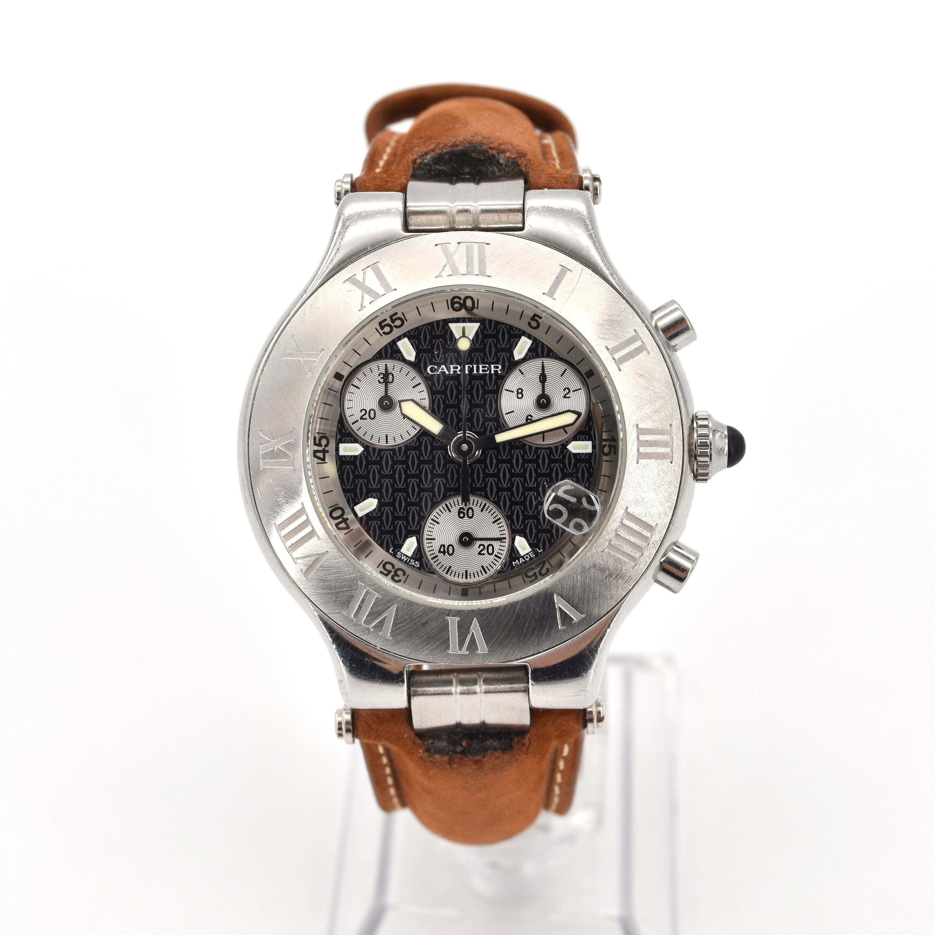 Bracelet-montre homme en acier Cartier Chronograph 21 quartz (bracelet en cuir avec boucle déployante en métal non d'origine, montre n°59451PL, calibre 372, griffé) (18 cm)