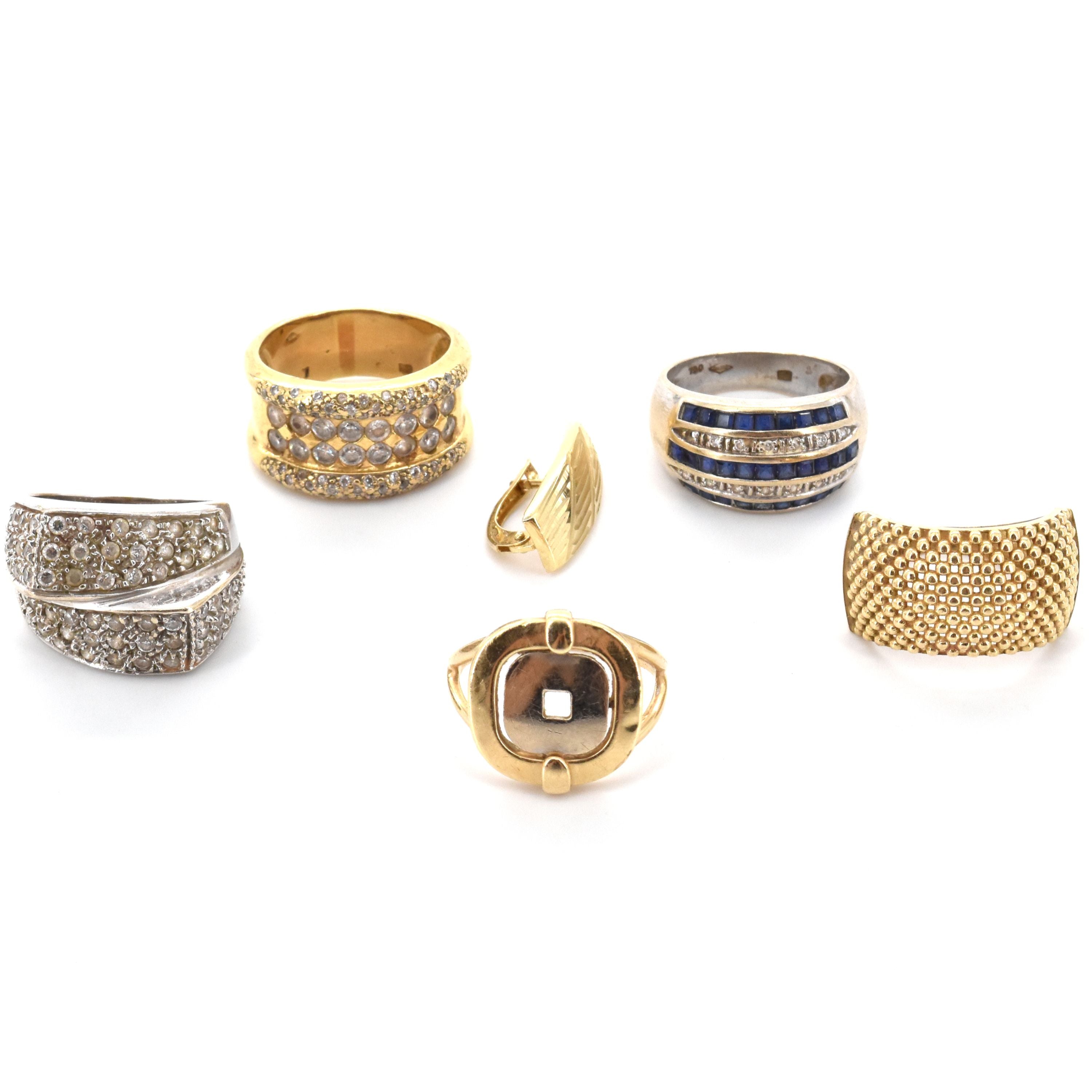 3 bagues en or jaune et blanc 18 ct (pierres fausses, pierres de couleur, pierre manque, bosselées) - 27.5 g brut (Tailles: 56, 57 & 54) 2 bagues et 1 boucle d'oreille en or jaune et blanc 14 ct (bosselées) - 8.3 g (Tailles: 55 x 2)