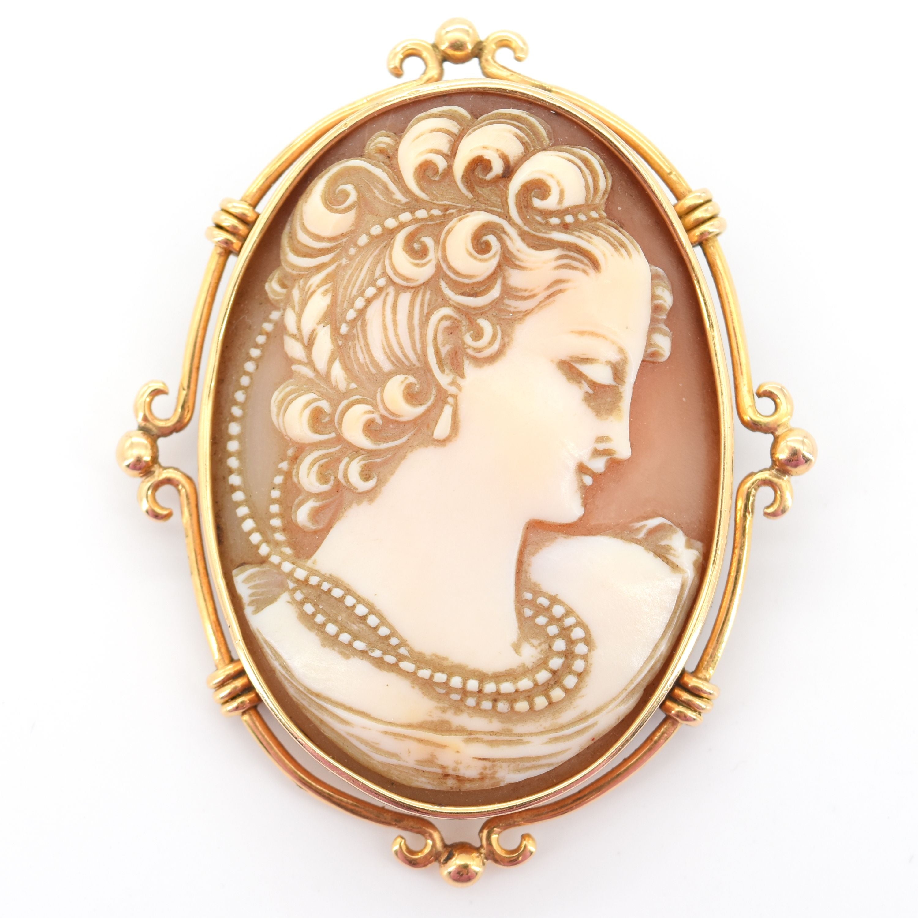 Broche en or jaune 18 ct avec partie et épingle en argent sertie d'1 camée (légèrement bosselée, étain) - 19.2 g brut