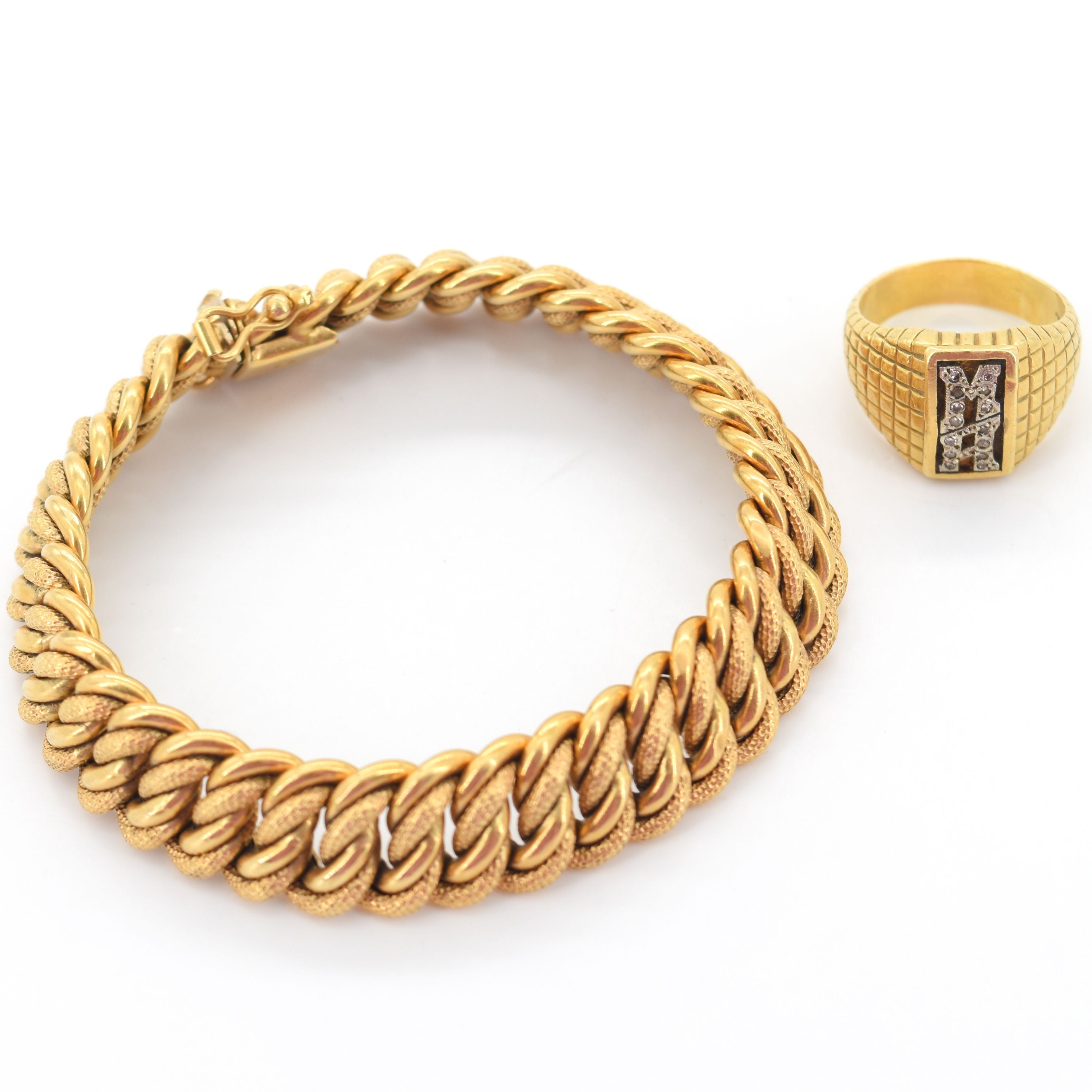 Chevalière et bracelet en or jaune et blanc 18 ct (pierres fausses, personnalisée, abîmée) - 49.8 g brut (Taille: 58) (19.5 cm)