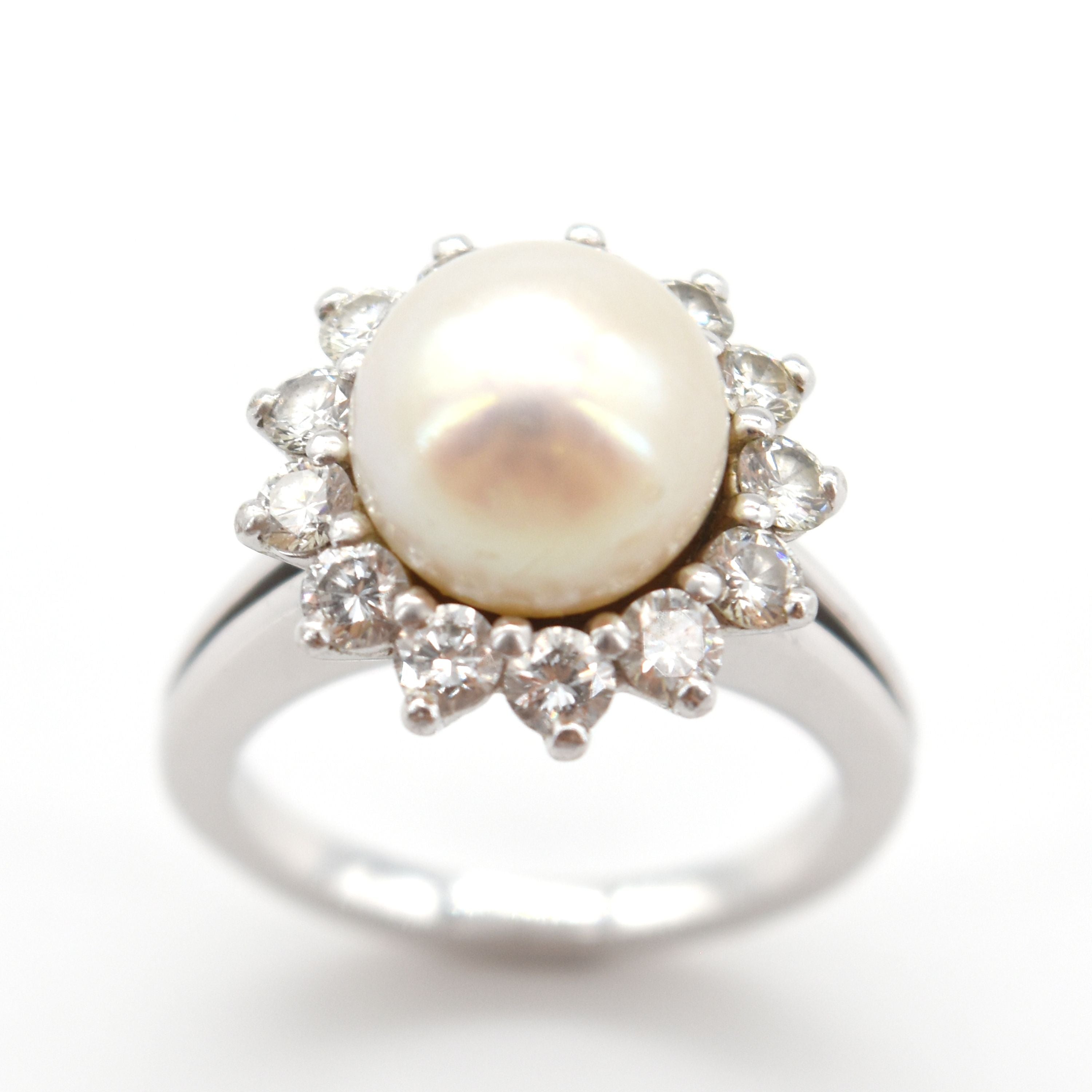 Ring in 18 kt witgoud bezet met 13 briljanten +/- 0.80 kt en 1 parel - 7.2 g bruto (Maat: 48.5)