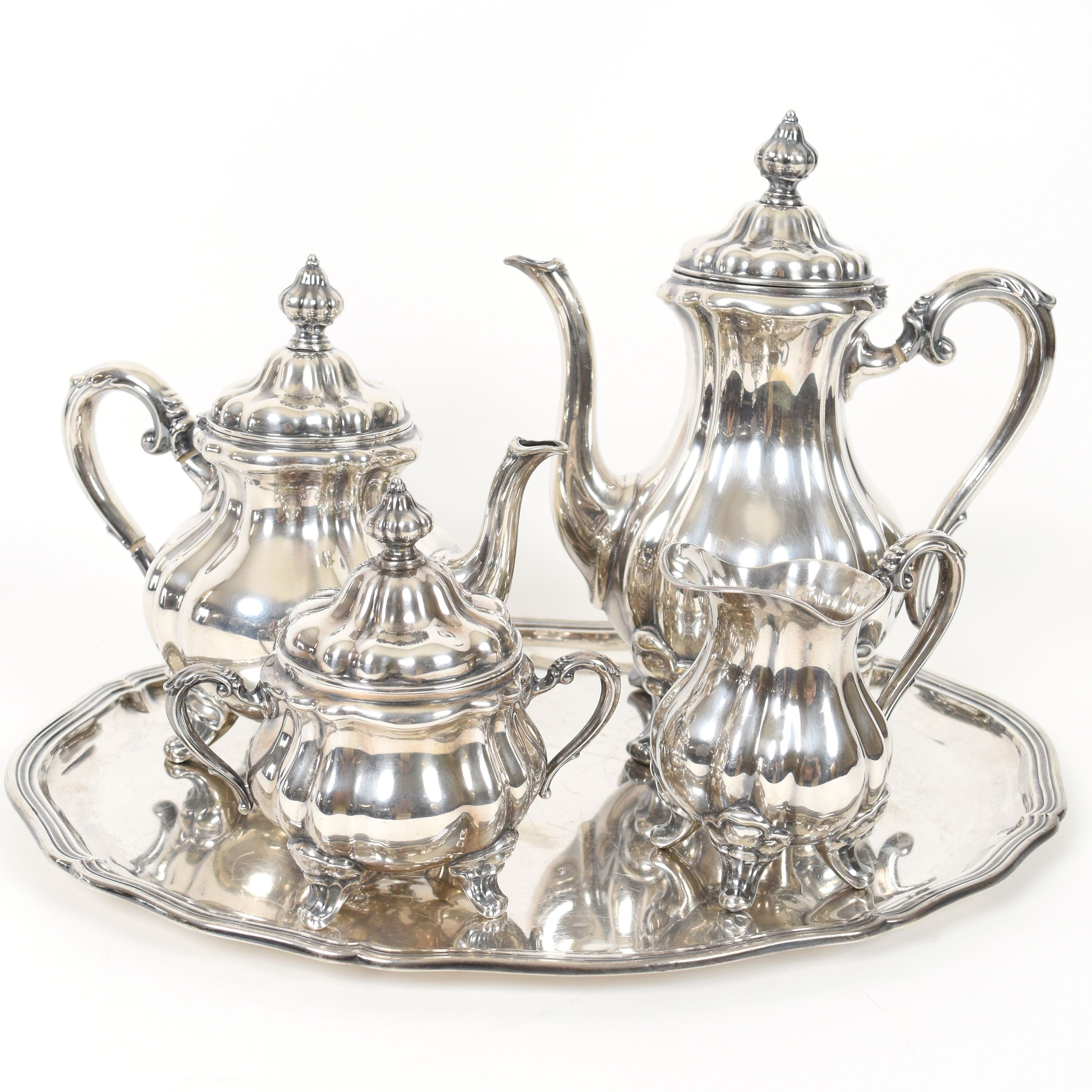 Servies in 925/1000 zilver bestaande uit 1 plateau (45 x 35 cm), 1 koffiepot, 1 theepot, 1 melkpot en 1 suikerpot (licht gedeukt, gekrast) - 2809.8 g