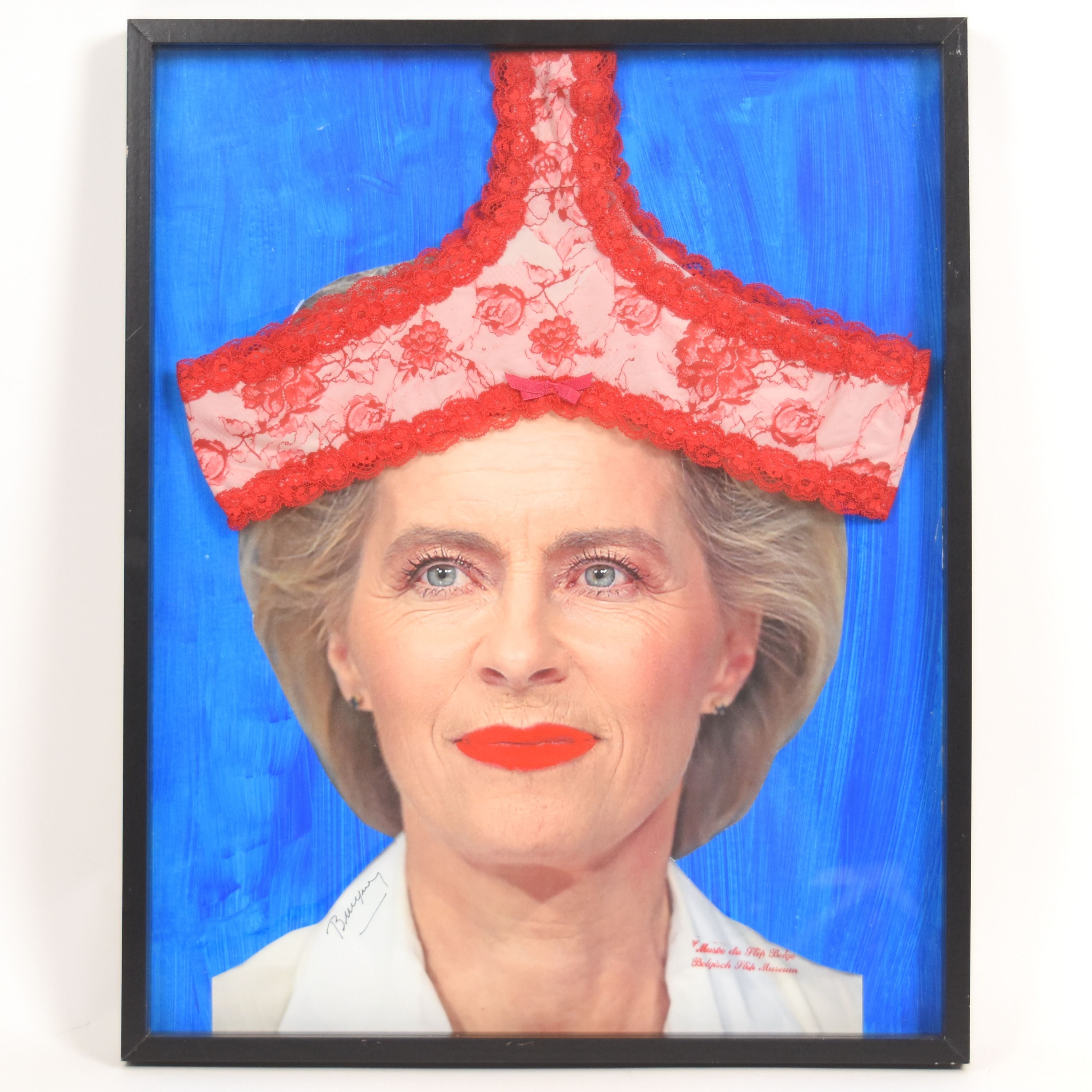 Gemengde techniek met roze en rode slip onder plexi getekend Jan BUCQUOY: "Ursula von der Leyen" 2020 (Belgisch Slipmuseum) (40 x 50 cm) + aanduiding van echtheid
