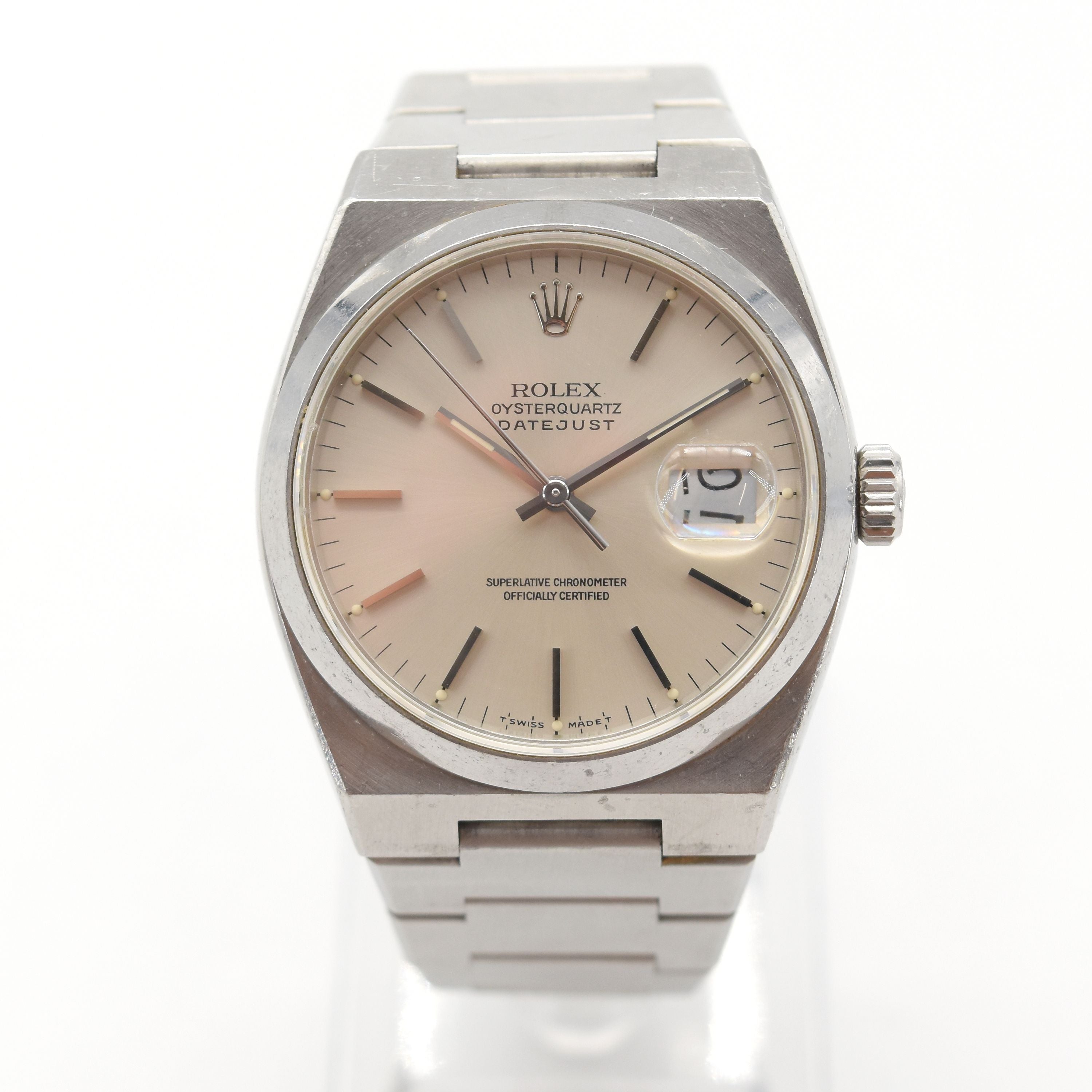 Herenpolshorloge in staal ROLEX Oyster Perpetual Datejust quartz (raderwerk nr 0094984, uurwerk nr E329075, datum indicator defect, gekrast) (+/- 16 cm) (Wijzerplaat: 38 mm)