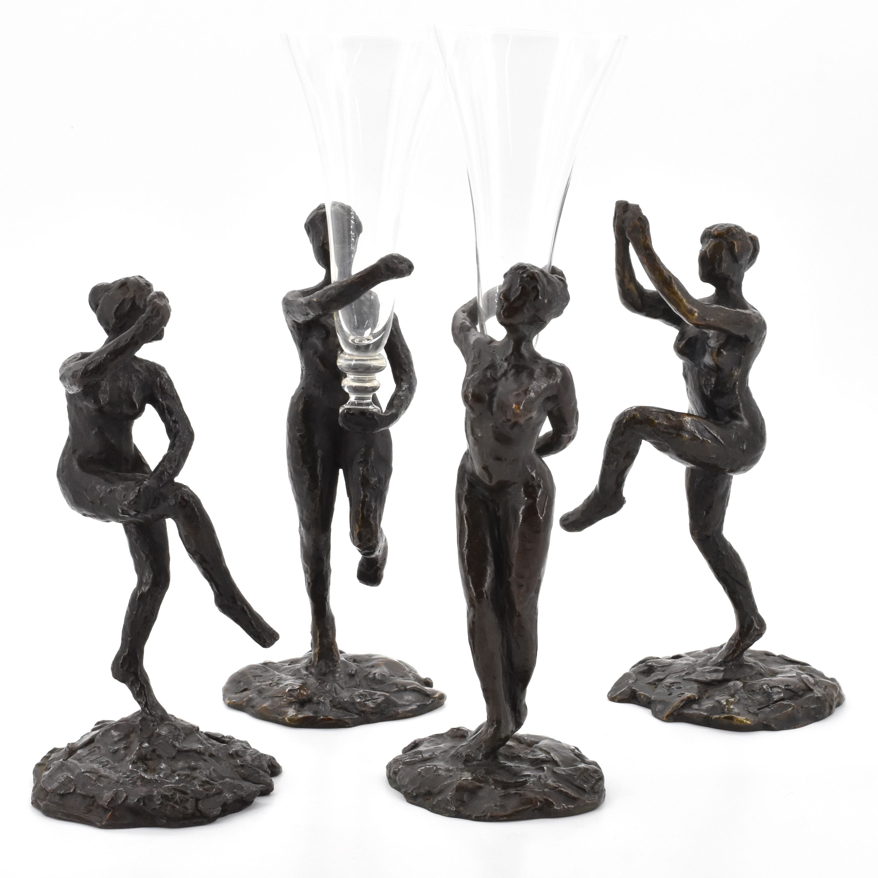 4 bronzen beeldjes getekend Patrick LAROCHE draagt 2 glazen (2 glazen ontbreken) (4 x 20 cm)