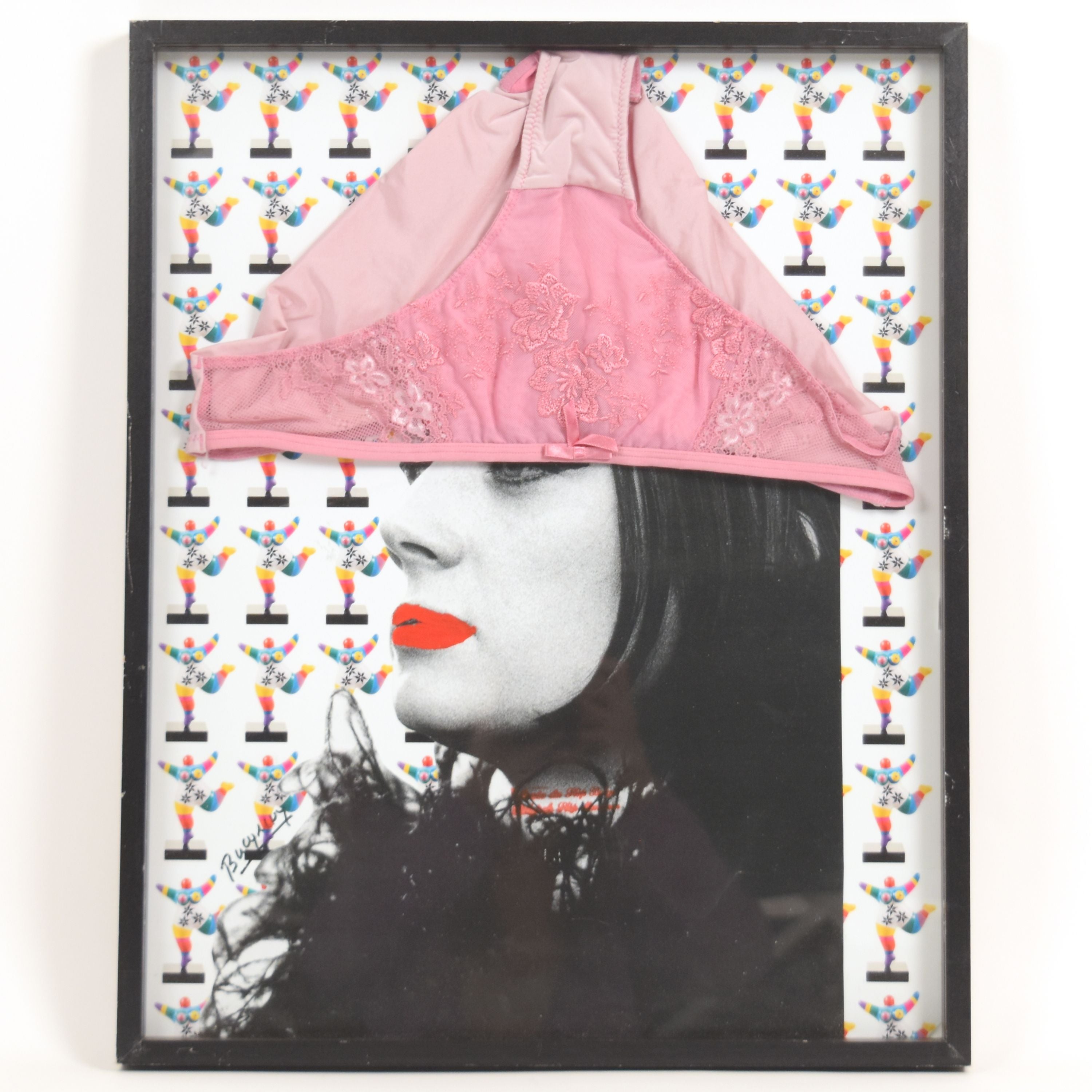 Gemengde techniek met roze slip onder plexi getekend Jan BUCQUOY: "Niki de Saint Phalle" 2003 (Belgisch Slipmuseum, kader beschadigd) (40 x 50 cm) + aanduiding van echtheid