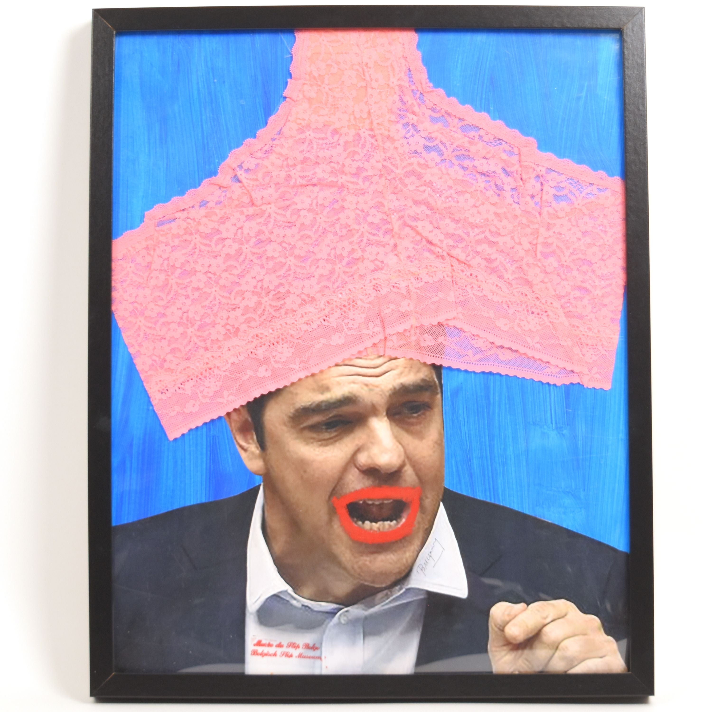 Gemengde techniek met zalmkleurige slip onder plexi getekend Jan BUCQUOY: "Aléxis Tsípras" 2020 (Belgisch Slipmuseum) (40 x 50 cm) + aanduiding van echtheid
