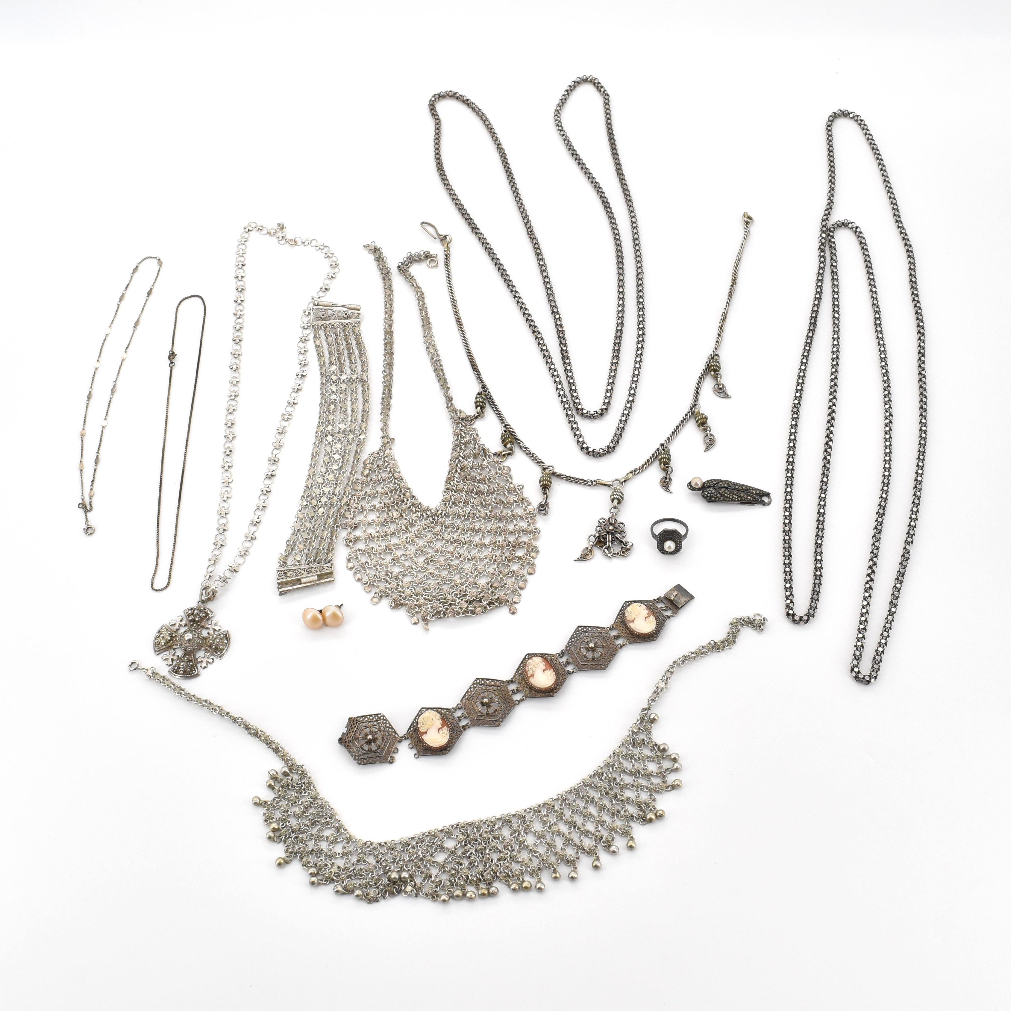 Lot van juwelen in zilver (cameeën, kleurstenen, valse parels, parels, beschadigd, gedeukt) - 373.9 g bruto
