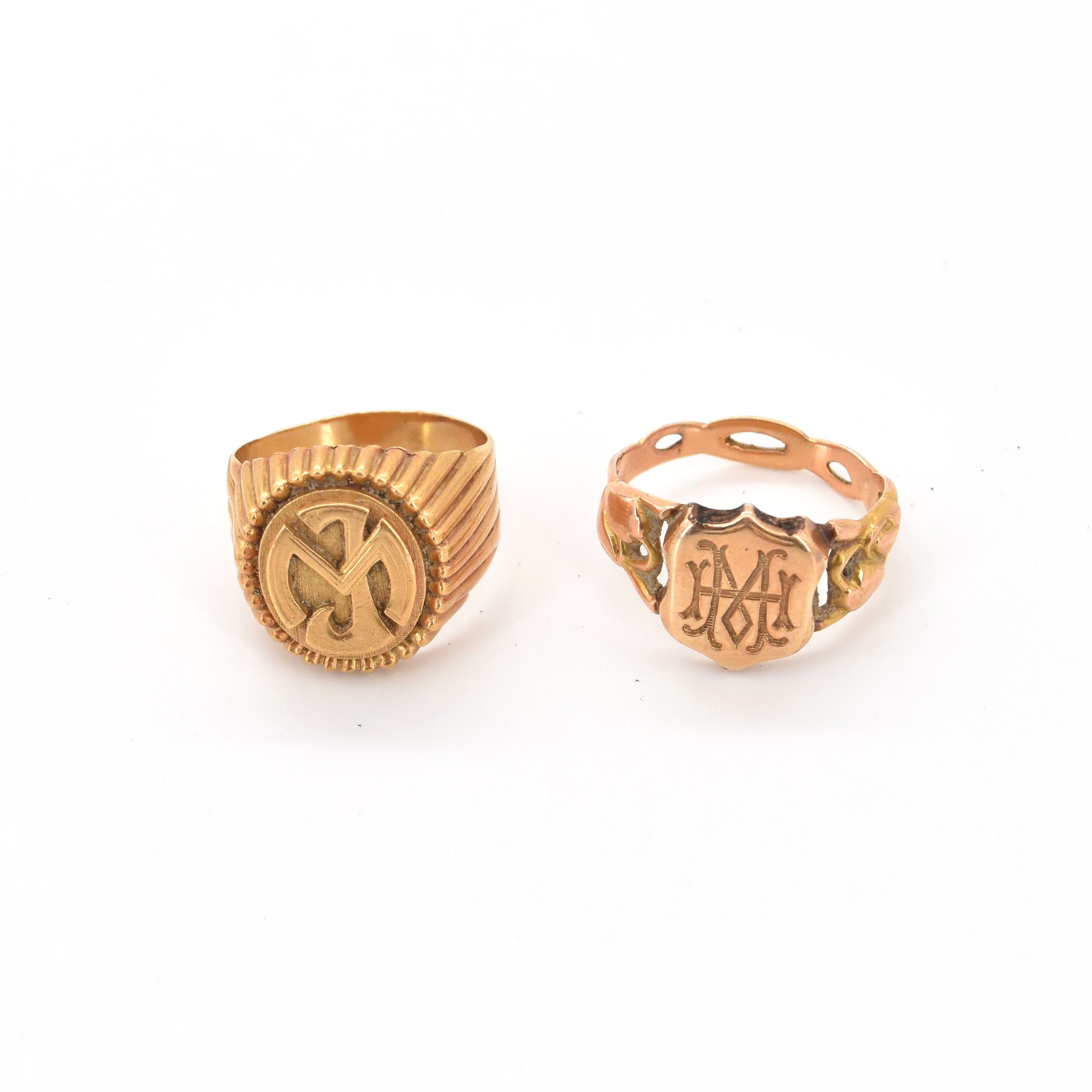 2 zegelringen in 18 kt geelgoud (gepersonaliseerd, gedeukt) - 17.8 g (Maat: 57.5 & 59)