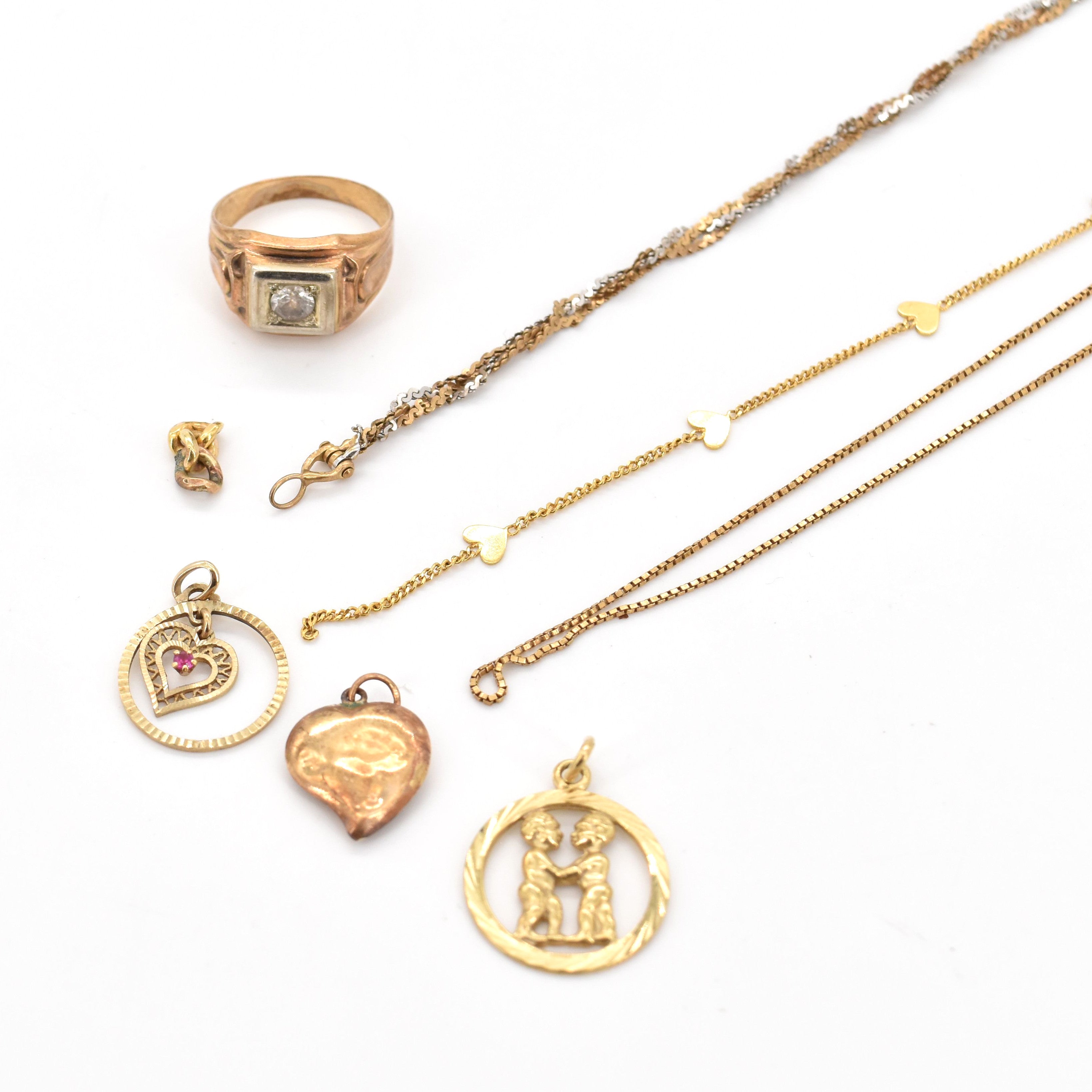 Halsketting, delen van halsketting, hanger en armband in 18 kt geel- en witgoud (gebroken, beschadigd, gedeukt) - 8.1 g (56, 13.5 & 18.5 cm) Zegelring, 2 hangers en 1 stuk ketting in laag goud gehalte (valse steen, kleursteen, gedeukt) - 6.1 g (Maat: 56)