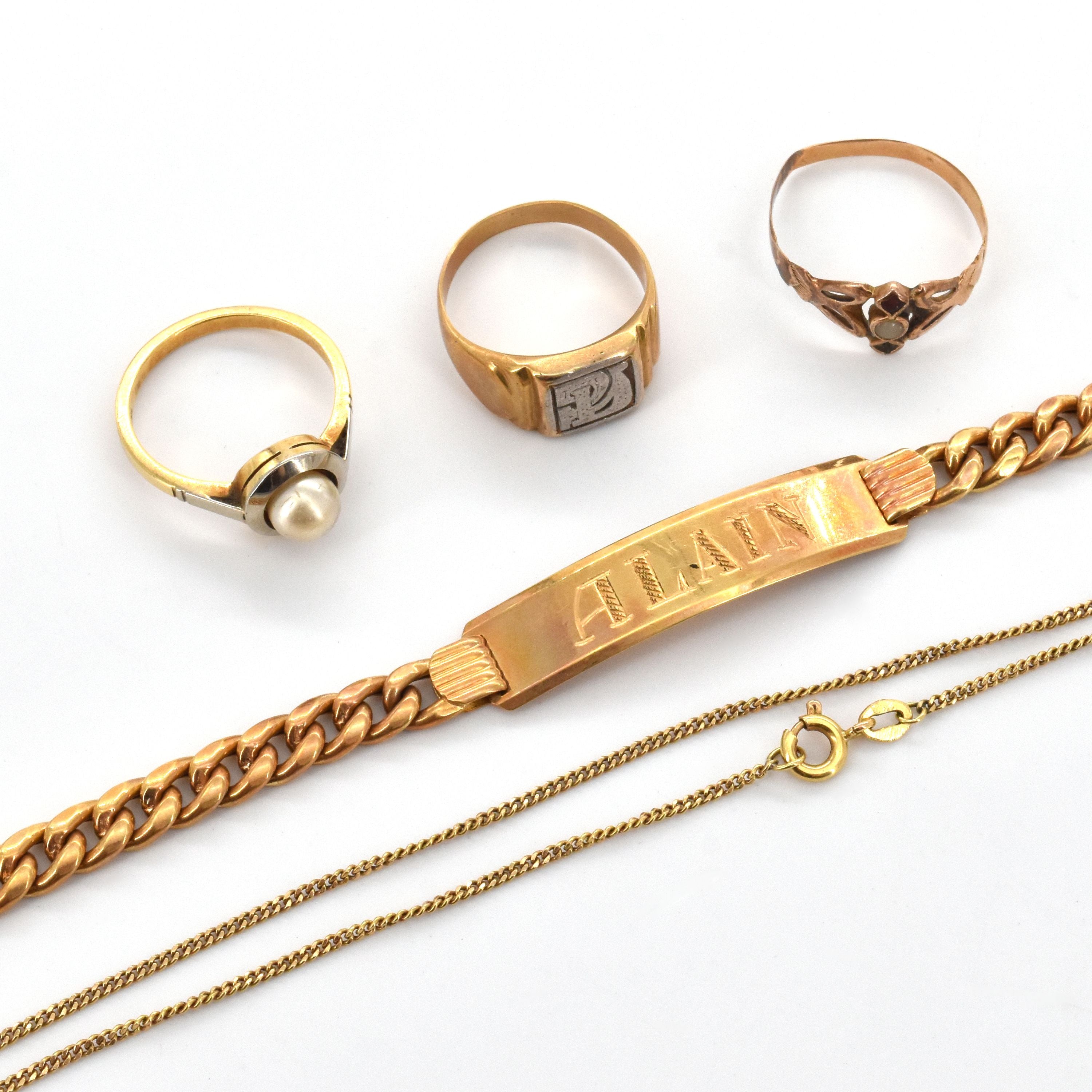 2 ringen, zegelring, halsketting en schakelarmband in 18 kt geel- en witgoud (kleursteen, steen ontbreekt, valse parels, beschadigd, gepersonaliseerd, gegraveerd, gedeukt) - 25.8 g bruto (Maten: 55 x 2 & 59) (43 & 18.5 cm)