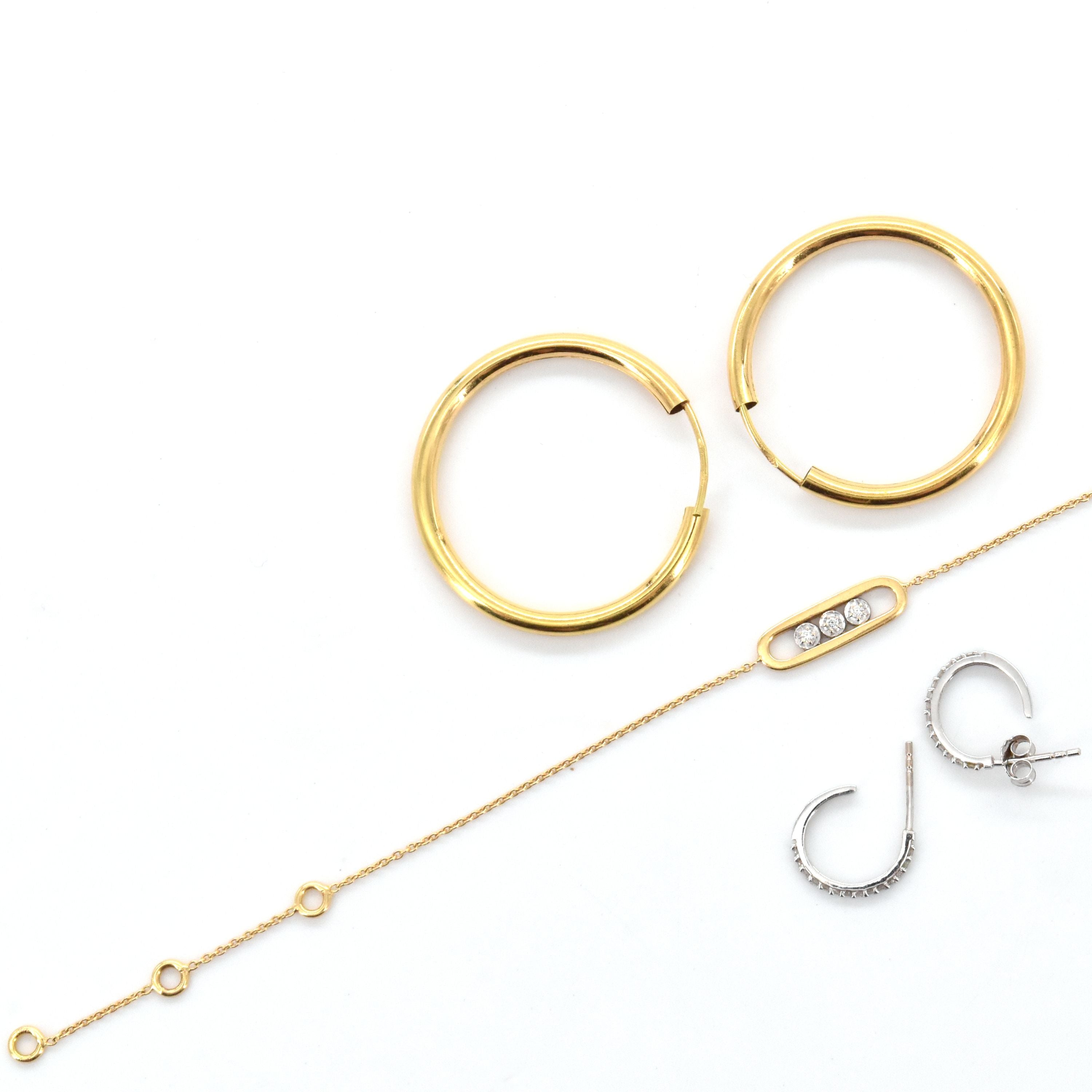 Armband en 4 oorbellen in 18 kt geel- en witgoud bezet met 31 briljanten +/- 0.17 kt (drukknoop ontbreekt) - 4.6 g (15 tot 18 cm)