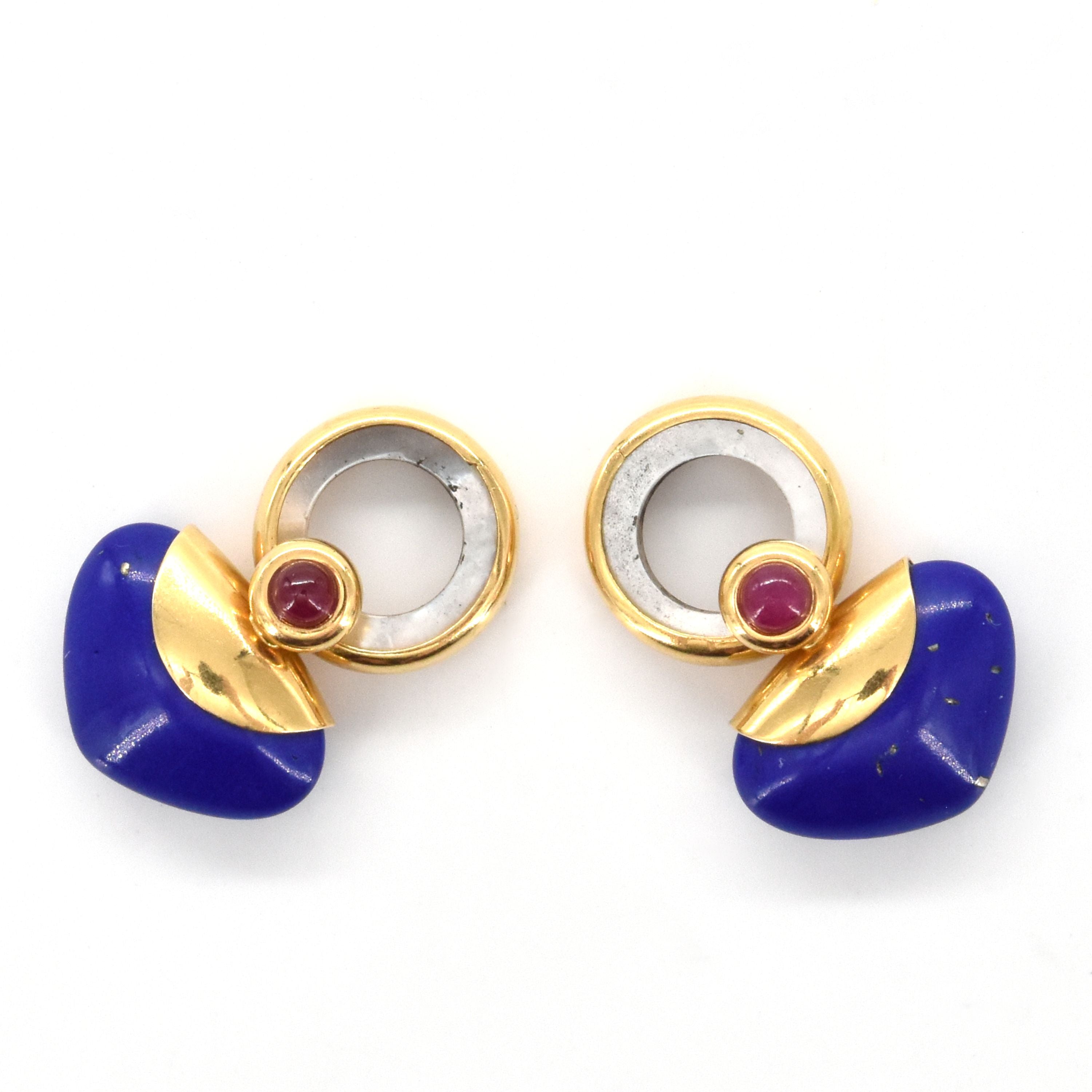 2 hangers voor oorringen in 18 kt geelgoud bezet met parelmoer en 2 robijnen (kleurstenen) - 7.3 g bruto