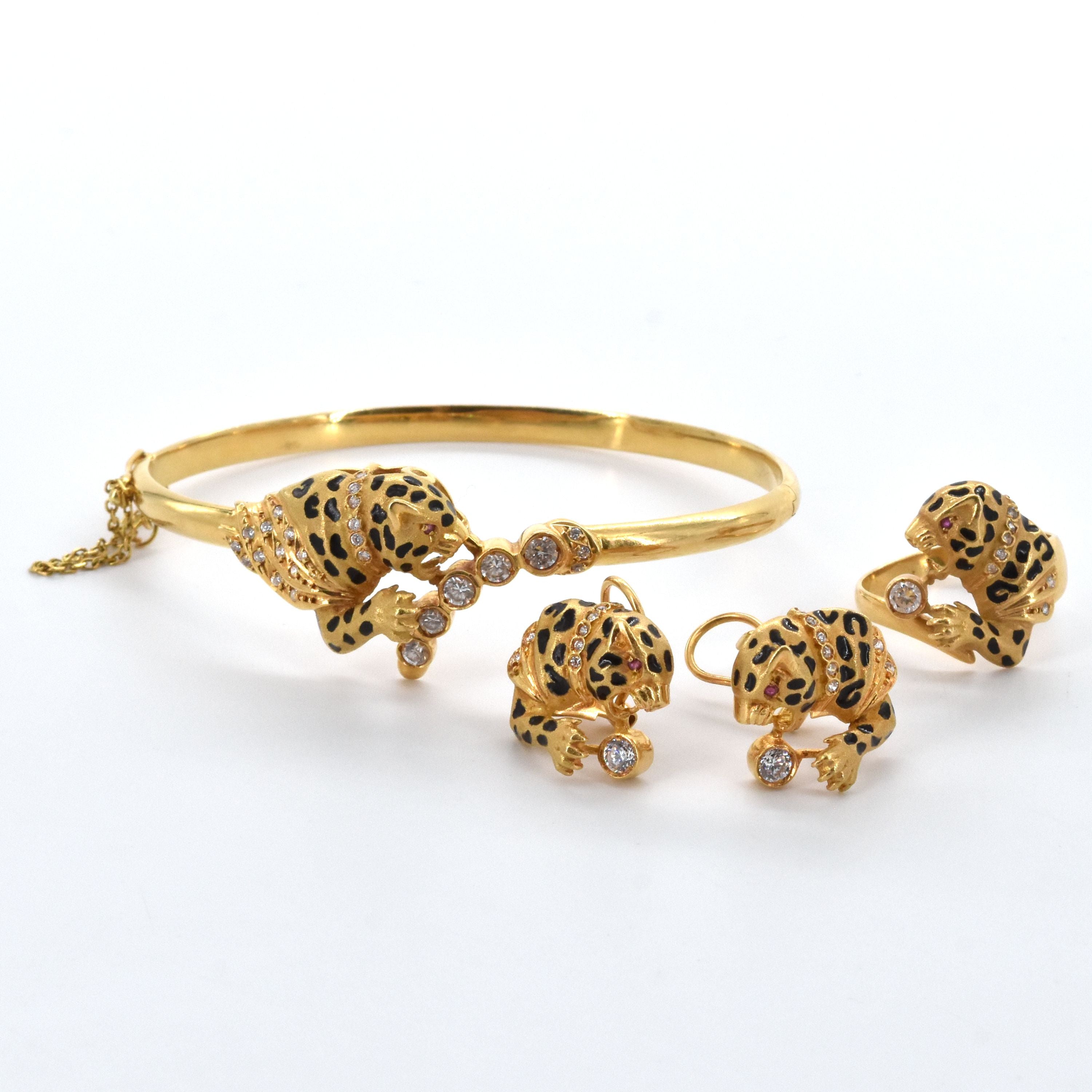 Ring, onbuigzame armband en 2 oorringen in 18 kt geelgoud (valse stenen, kleurstenen, email, beschadigd, gedeukt) - 24.6 g (Maat: 56) (17 cm)