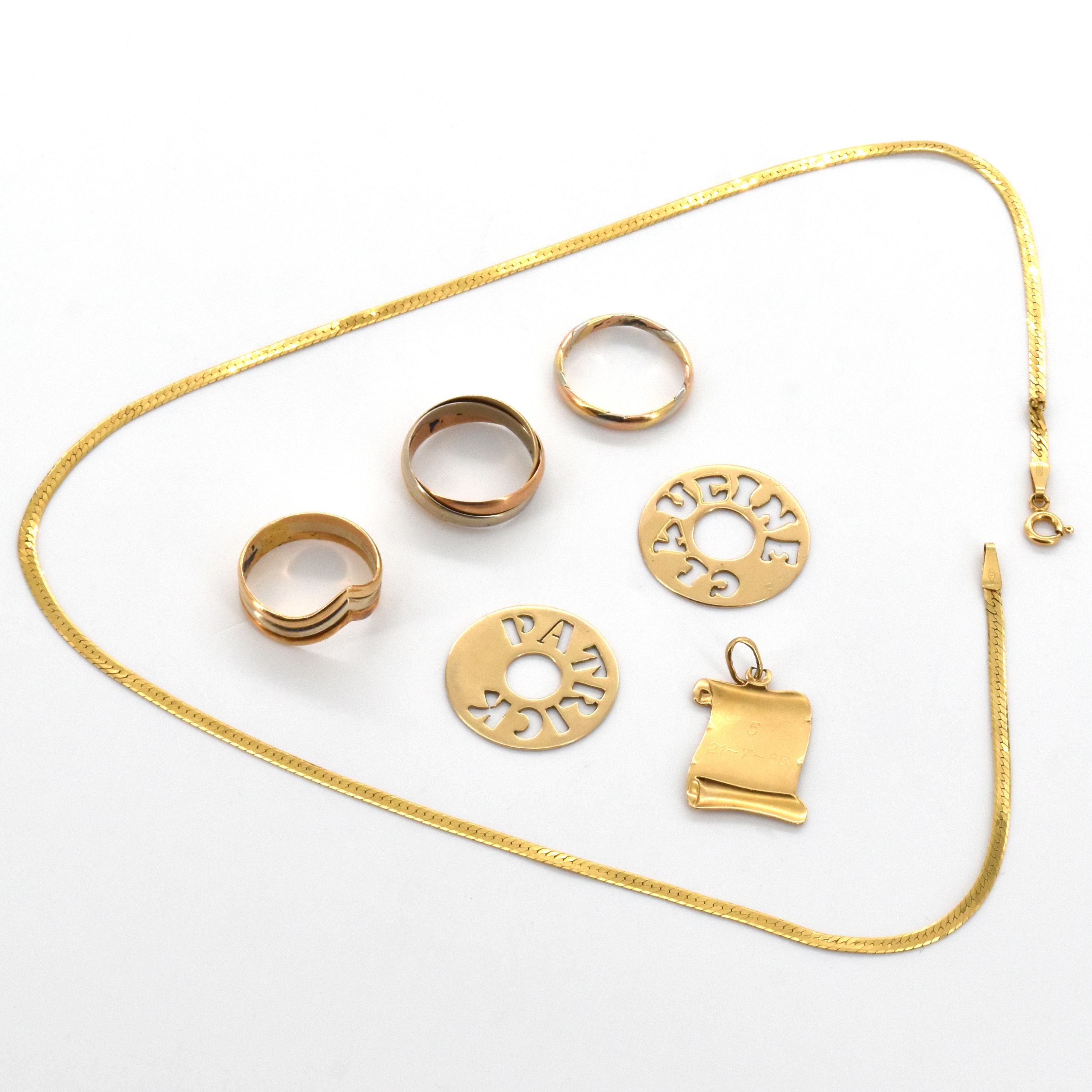 3 ringen, halsketting en 3 hangers in 18 kt 3-kleurengoud (gepersonalisserd, beschadigd, gedeukt) - 26.8 g (Maten: 56 x 2 & 57) (46.5 cm)