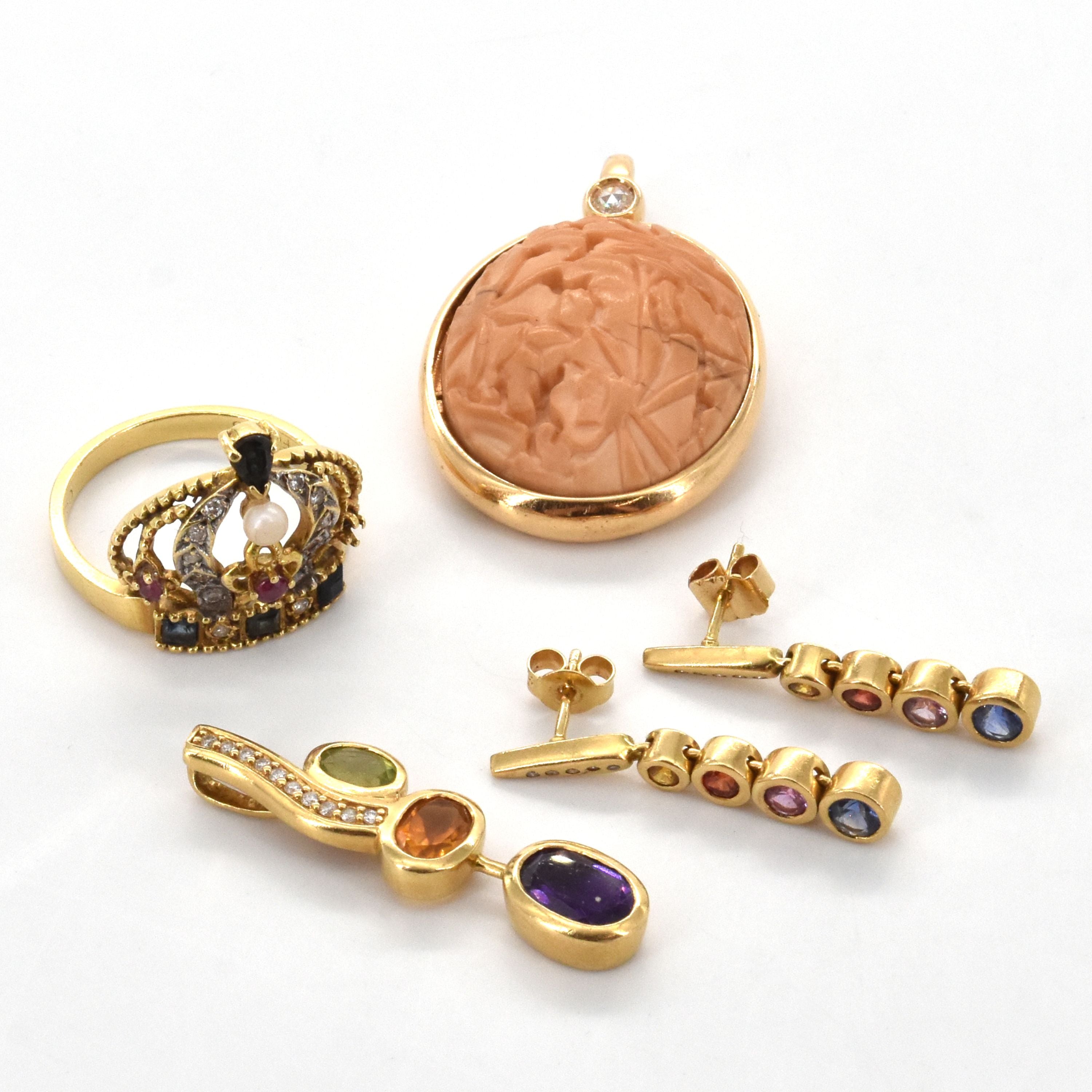 Ring in 18 kt geelgoud bezet met 12 briljanten +/- 0.10 kt (kleurstenen, parel, parel beschadigd) - 7.1 g (Maat: 60) Hanger in 18 kt geelgoud bezet met 10 briljanten +/- 0.10 kt (kleurstenen, steen beschadigd) - 5.4 g 2 oorringen in 18 kt geelgoud bezet met 10 briljanten +/- 0.10 kt (kleurstenen) - 5.3 g bruto Hanger in 18 kt geelgoud bezet met 1 gegraveerde kleursteen en 1 diamantroosje - 13.7 g bruto