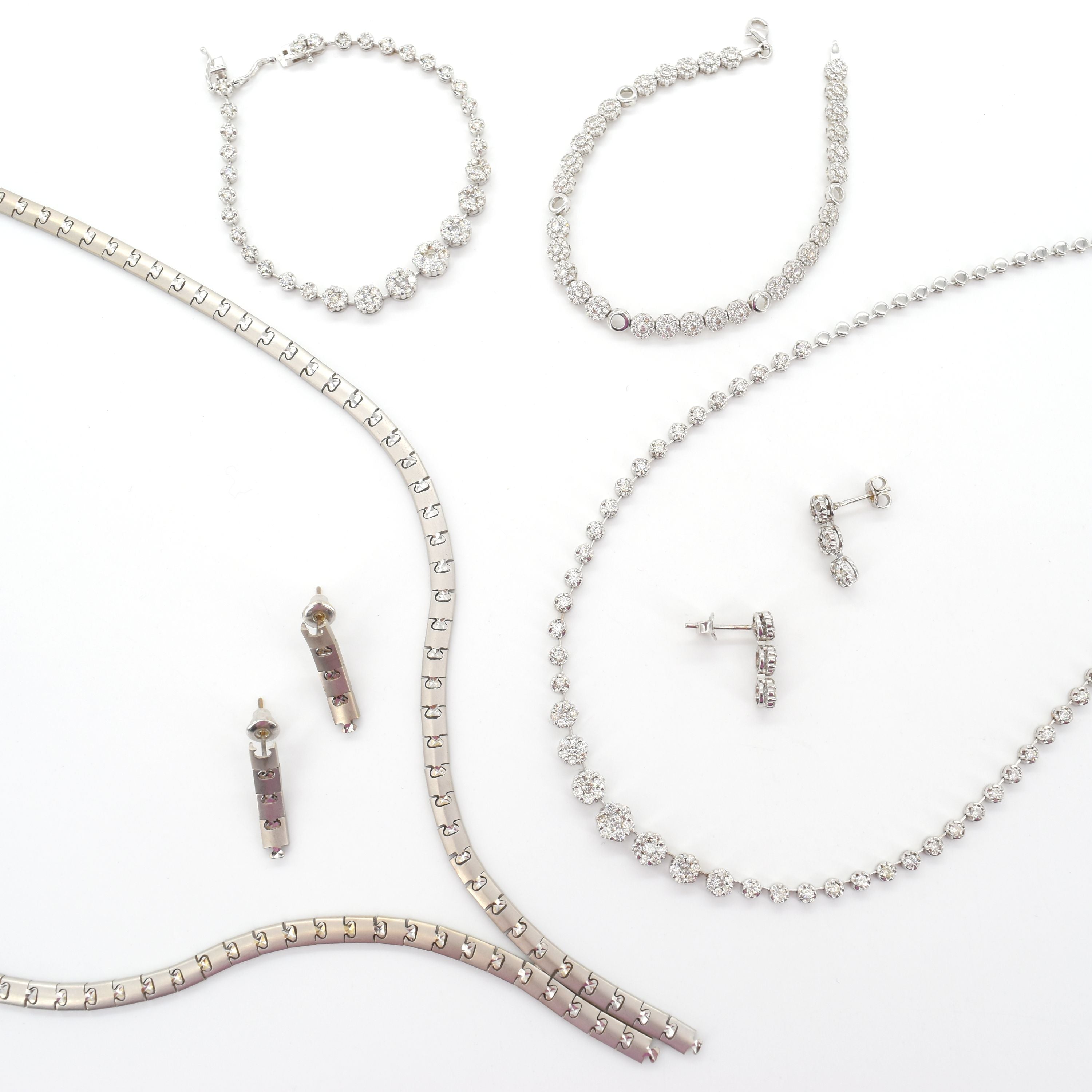 Halsketting, armband en 2 oorringen in 18 kt witgoud bezet met een mengeling van 199 natuurlijke en lab grownbriljanten +/- 8 kt - 34.4 g (44 & 16.5 cm) Halsketting, armband en 2 oorringen in 18kt witgoud (valse stenen) - 43.1 g bruto (45 cm)