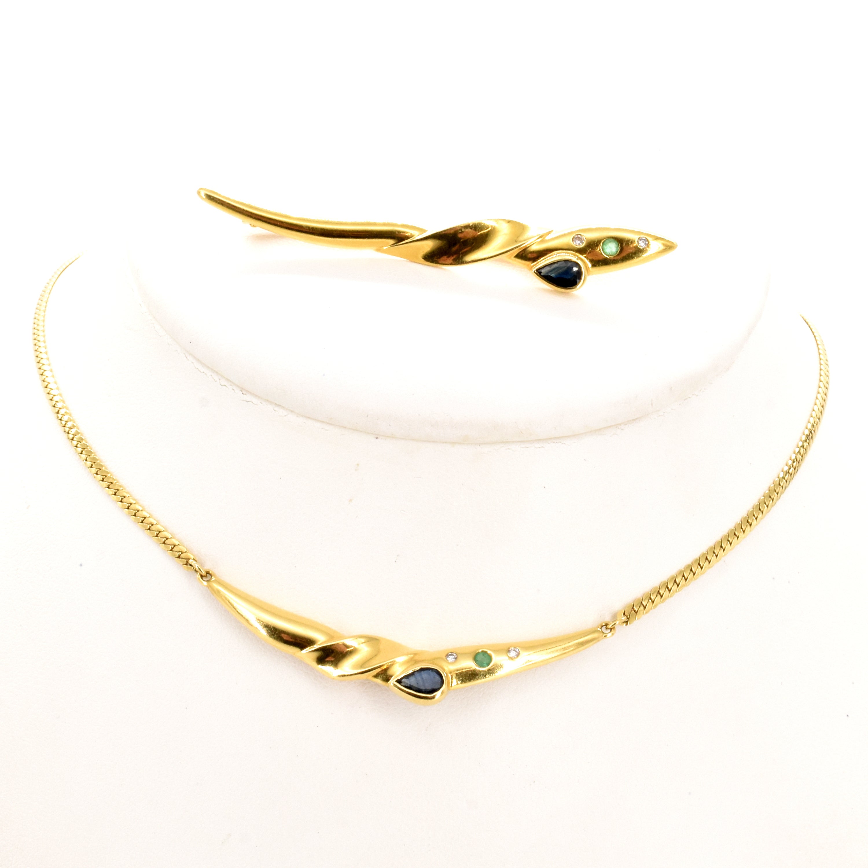 Halsketting en borstspeld in 18 kt geelgoud bezet met 4 briljanten +/- 0.08 kt (kleurstenen) - 15.4 g bruto (40 cm)