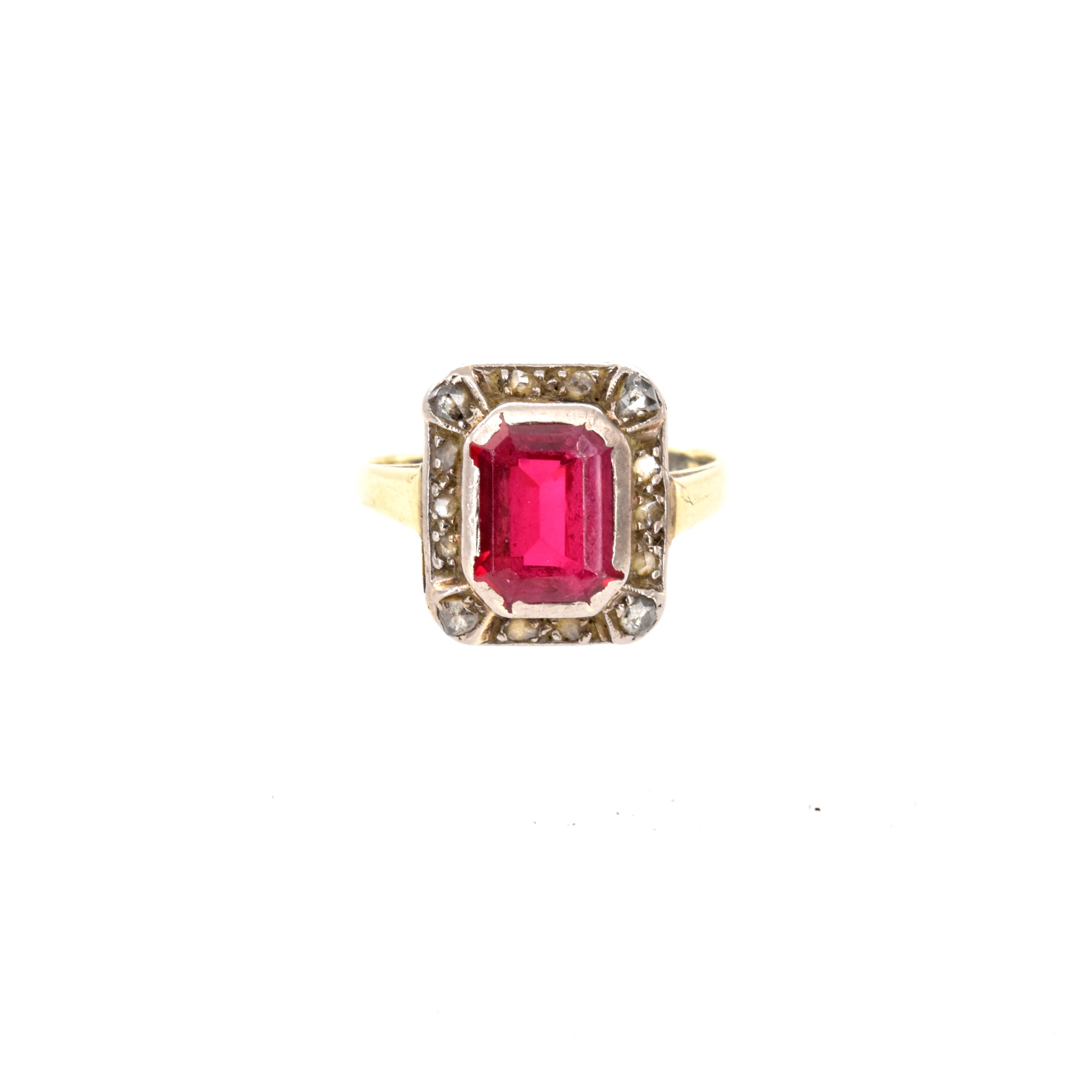 Ring in 14 kt geelgoud met gedeelte in zilver bezet met diamantroosjes (kleursteen, gedeukt) - 3.6 g bruto (Maat: 56)