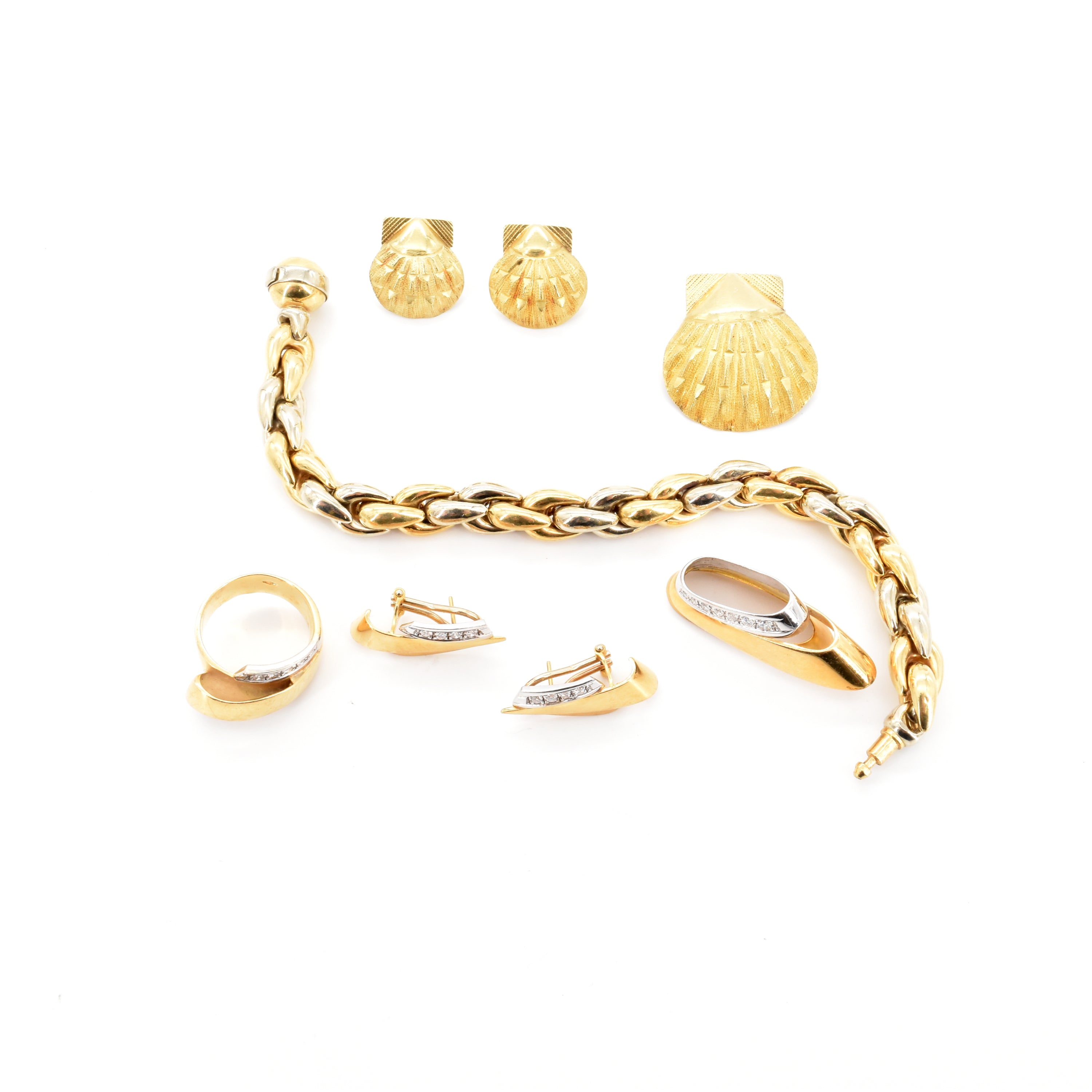 Ring, armband, 2 hangers en 4 oorringen in 18 kt geel- en witgoud bezet met 20 briljanten +/- 0.60 kt (drukknoop in metaal, gedeukt) - 83.8 g bruto (Maat: 57) (20.5 cm)