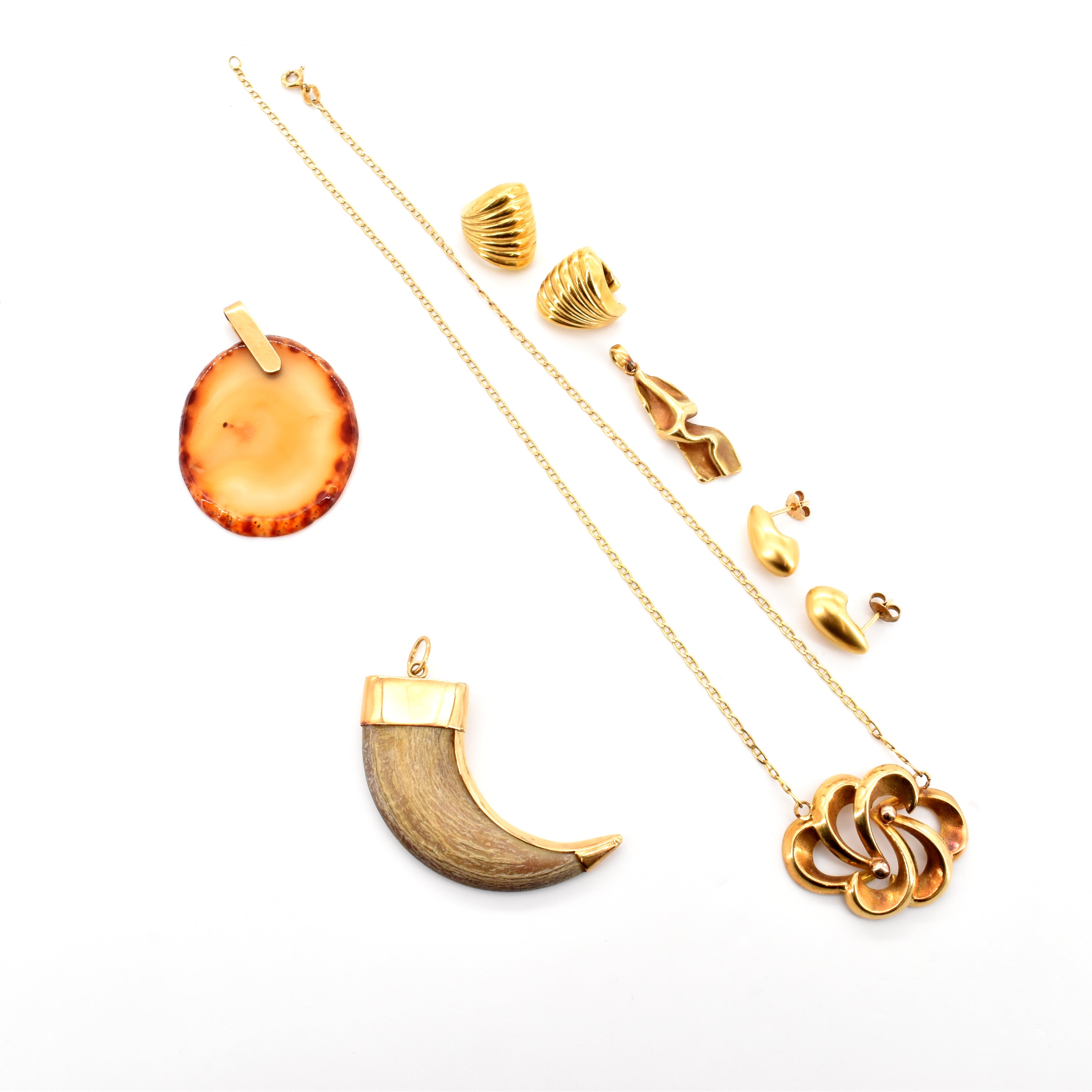 Halsketting met vastgehechte hanger, 2 hangers en 4 oorringen in 18 kt geelgoud (kleursteen, drukknoop in metaal, gedeukt) - 38 g bruto (43 cm) Hanger in 14 kt geelgoud bezet met 1 grif (beschadigd) - 7.1 g bruto