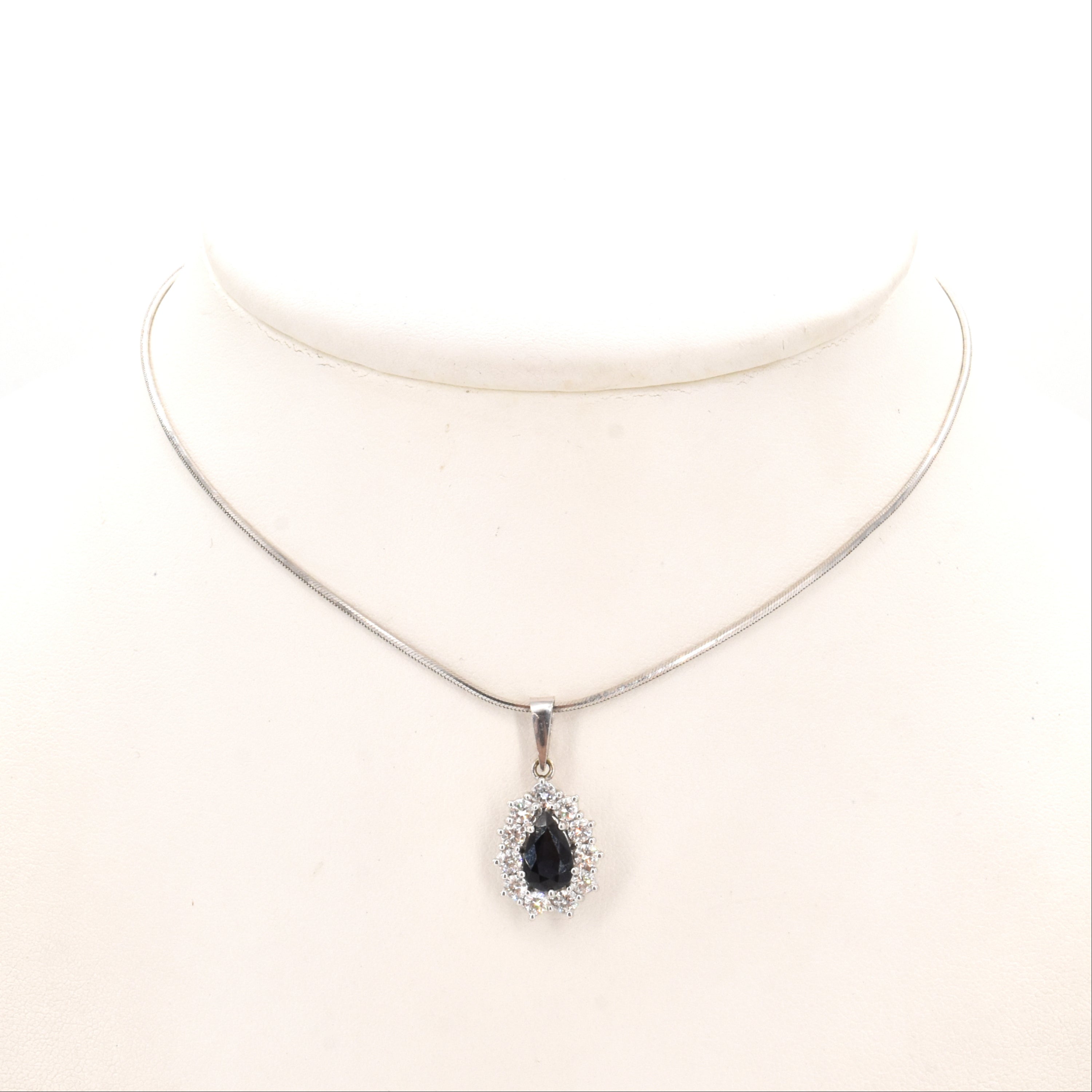 Halsketting en hanger in 18 kt witgoud bezet met 11 briljanten +/- 0.80 kt en saffier - 7.1 g (45 cm)