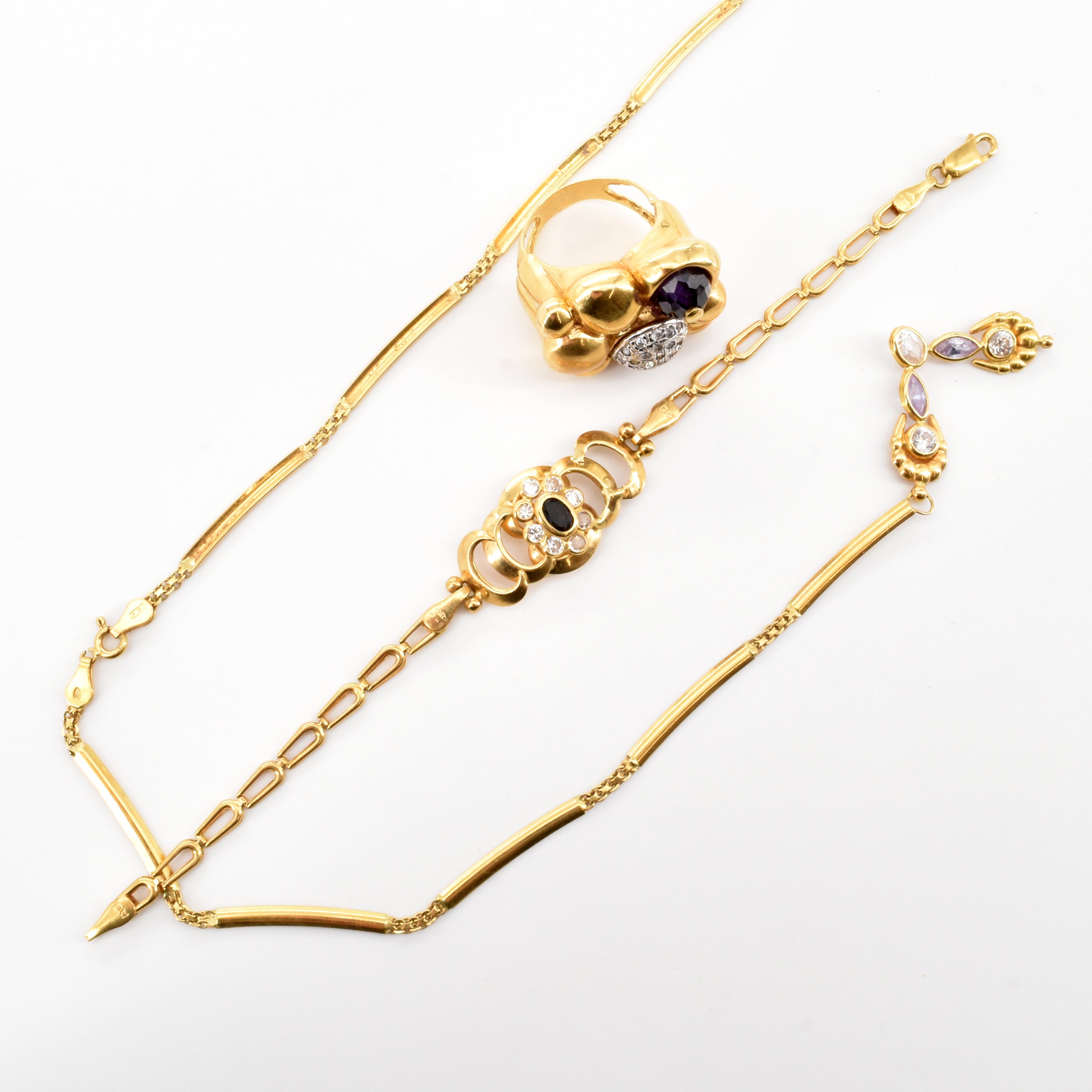 Ring, halsketting en armband in 18 kt geelgoud (valse stenen, kleurstenen, vulling in de ring, gebroken) - 29.6 g bruto (Maat: 62) (19 cm)