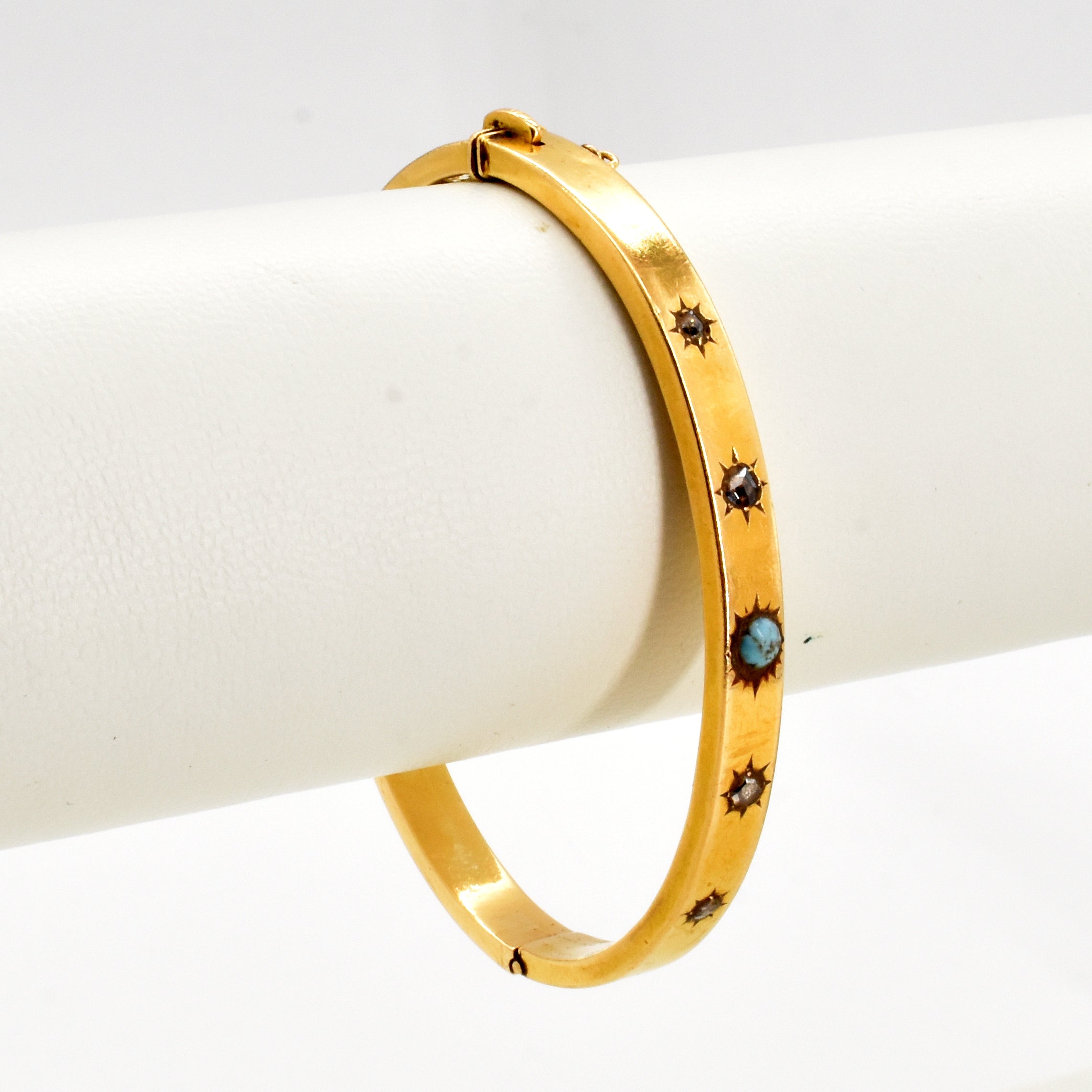 Onbuigzame armband in 18 kt geelgoud bezet met 1 turkoois en 4 diamantroosjes (veiligheidsketting in metaal, gedeukt) - 15.7 g bruto (17 cm)