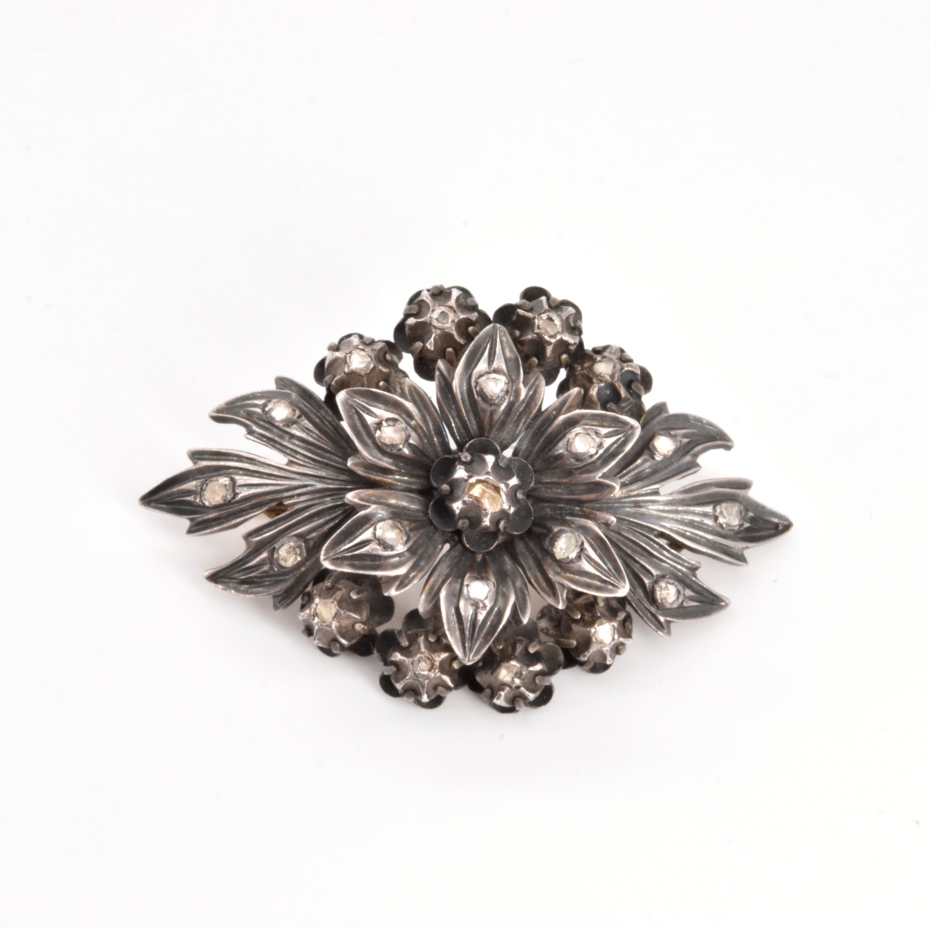 Antieke borstspeld in zilver met delen in 9 kt geelgoud bezet met diamantenroosjes (deel in metaal, tin) - 28 g bruto