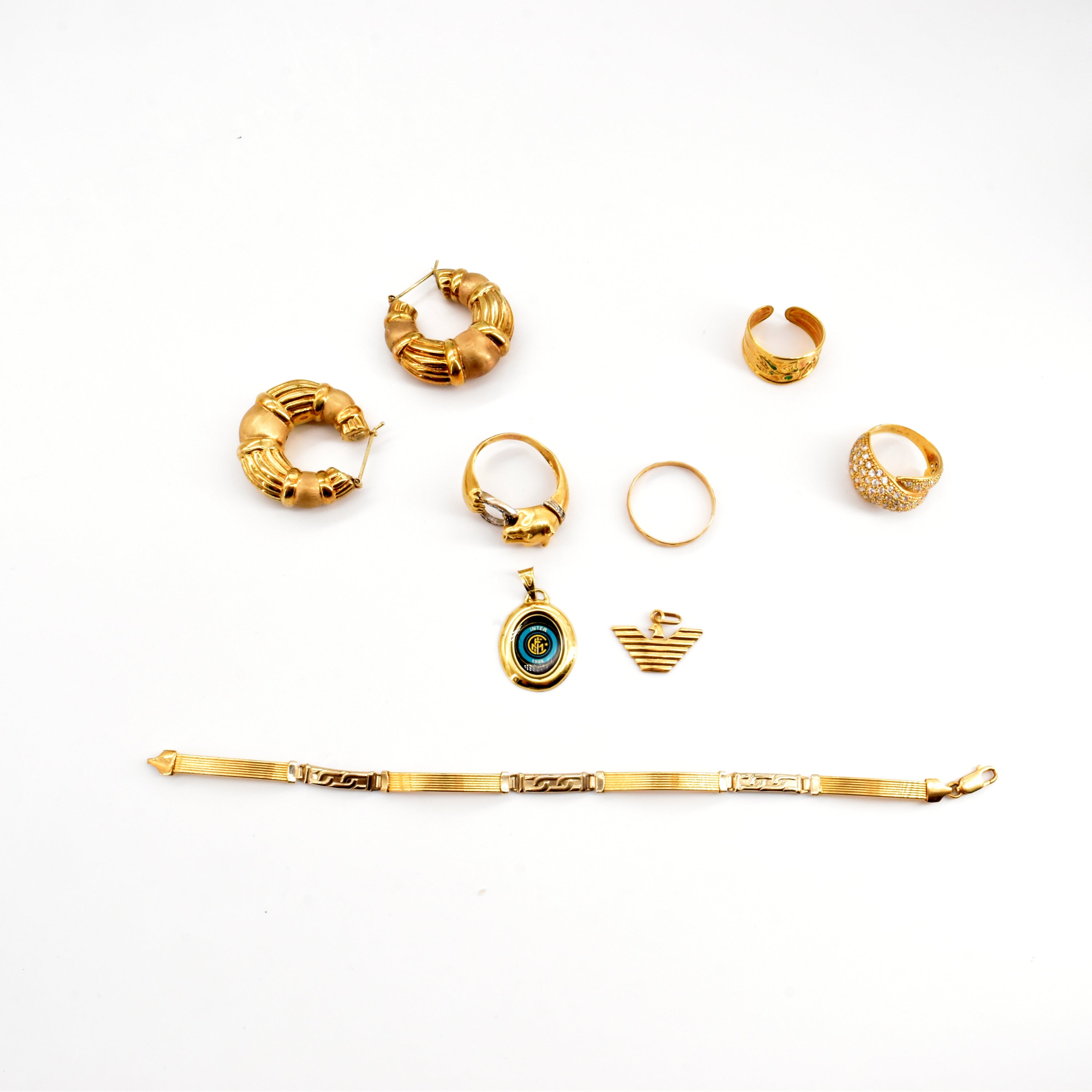 Trouwring, 3 ringen, armband en 2 hangers in 18 kt geel- en witgoud (valse stenen, email beschadigd, hars, gedeukt) - 31 g (Maten: 63, 56, 61 & 54) (20 cm) 2 oorringen van 18 kt geelgoud met stekers in 14 kt geelgoud - 8.4 g bruto