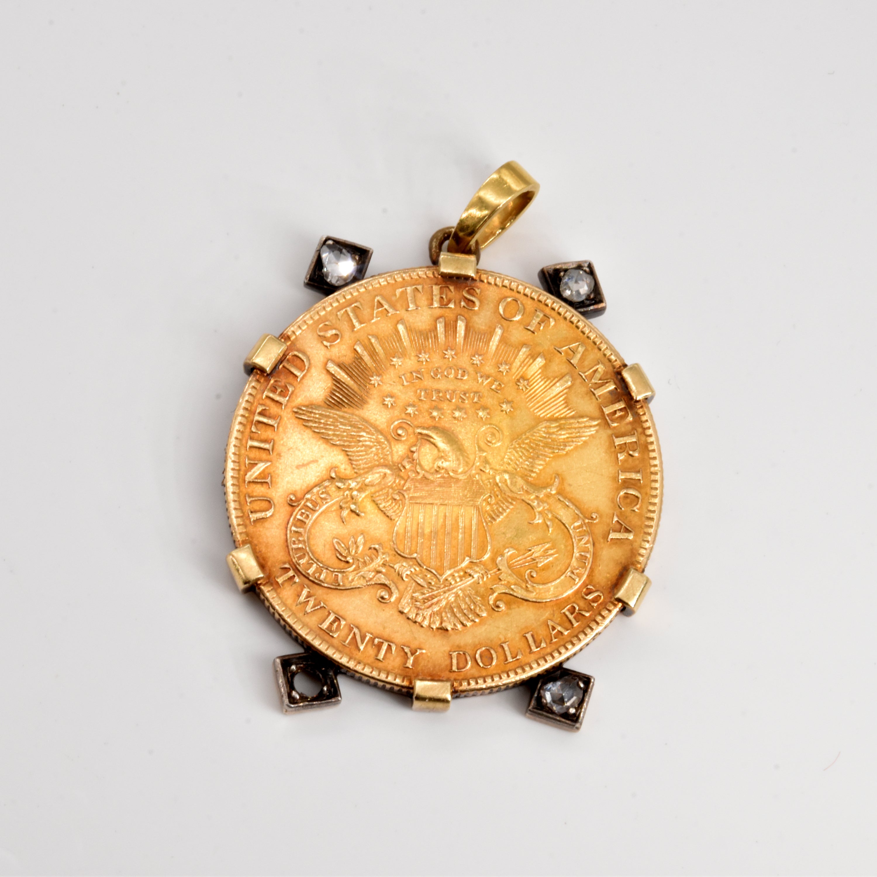 Hanger in 18 kt geelgoud en zilver bezet met diamantroosjes en 1 muntstuk in geelgoud 900/1000 (amerikaanse-20 dollar-1894) (steen ontbreekt, beschadigd) - 40.5 g bruto