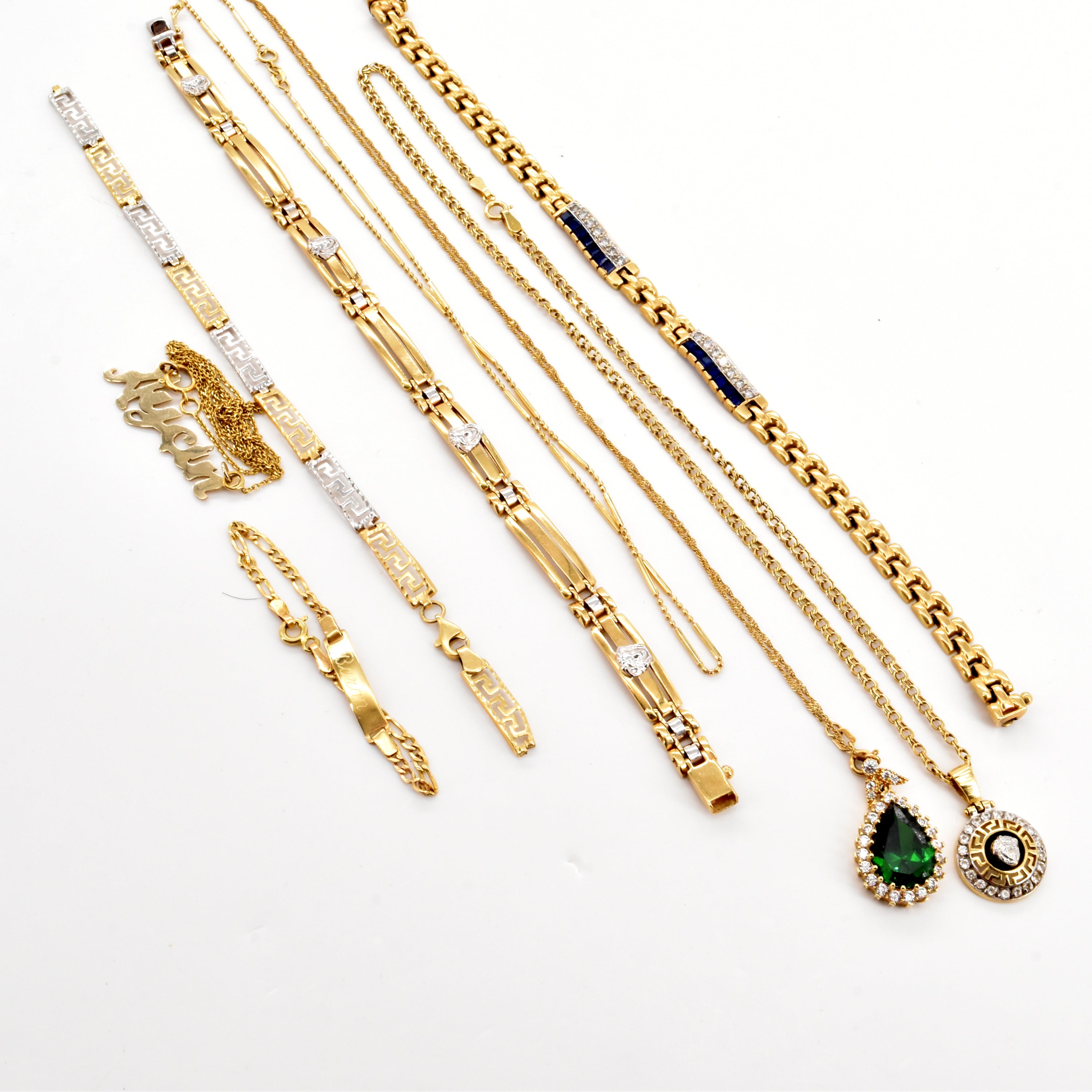 4 halskettingen, 2 hangers, 3 armbanden en schakelarmband in 14 kt geel- en witgoud (valse stenen, kleurstenen, gebroken, sluiting ontbreekt, gepersonaliseerd) - 47.6 g (40, 45, 48, 54, 12, 20 & 21 cm)