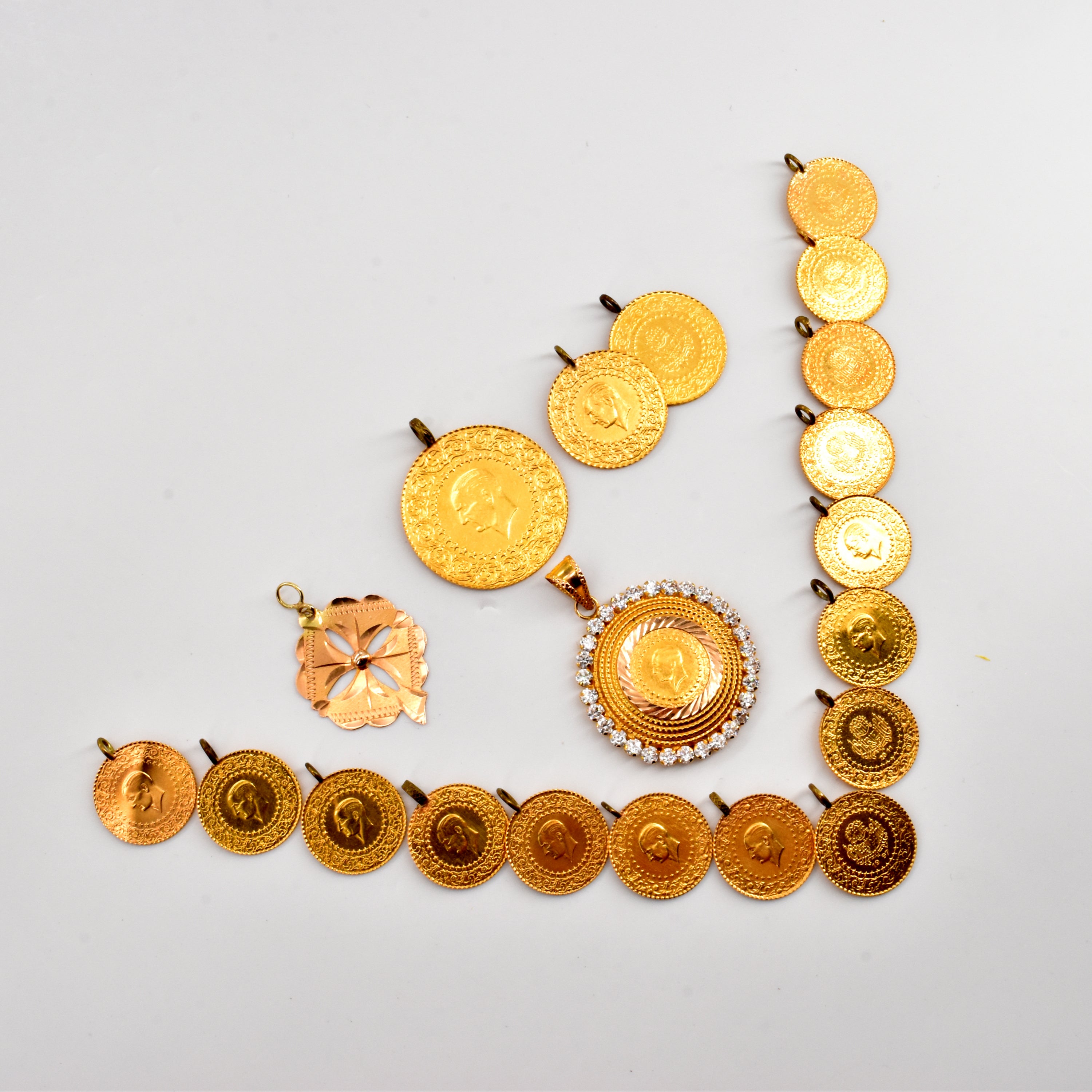 18 hangers in 18 kt geelgoud (lusogen in metaal, gedeukt) - 41.7 g bruto Hanger in 14 kt geelgoud (gedeukt) - 1.5 g Hanger in 14 kt geelgoud bezet met 1 muntstuk in 18 kt geelgoud (valse stenen) - 5.4 g bruto