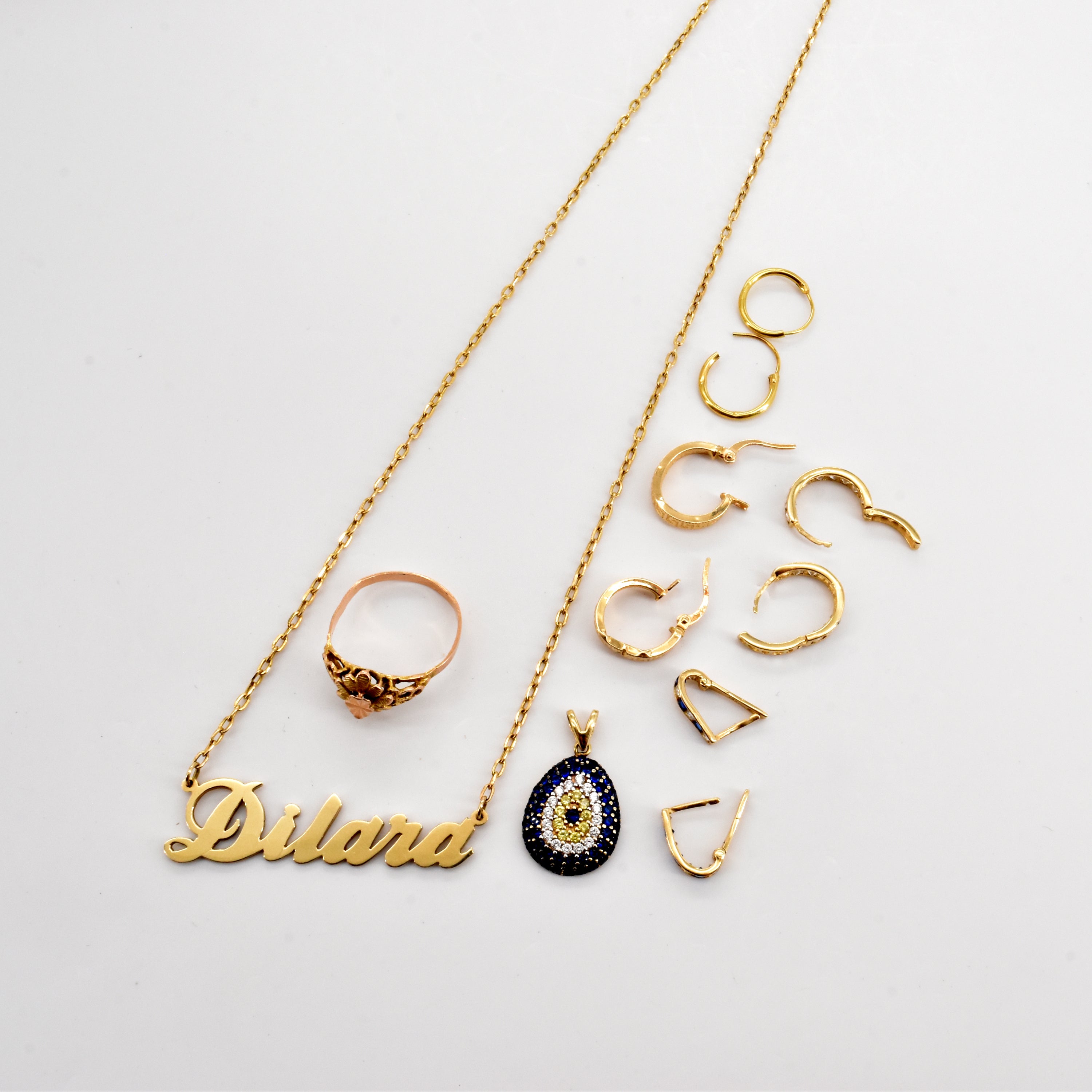 2 oorringen in 18 kt geelgoud (beschadigd) - 0.3 g Ring, halsketting met vastgehechte hanger, hanger en 6 oorringen in 14 kt geelgoud (valse stenen, kleurstenen, stenen ontbreken, gepersonaliseerd, beschadigd) - 11.7 g bruto (maat: 55) (52 cm)