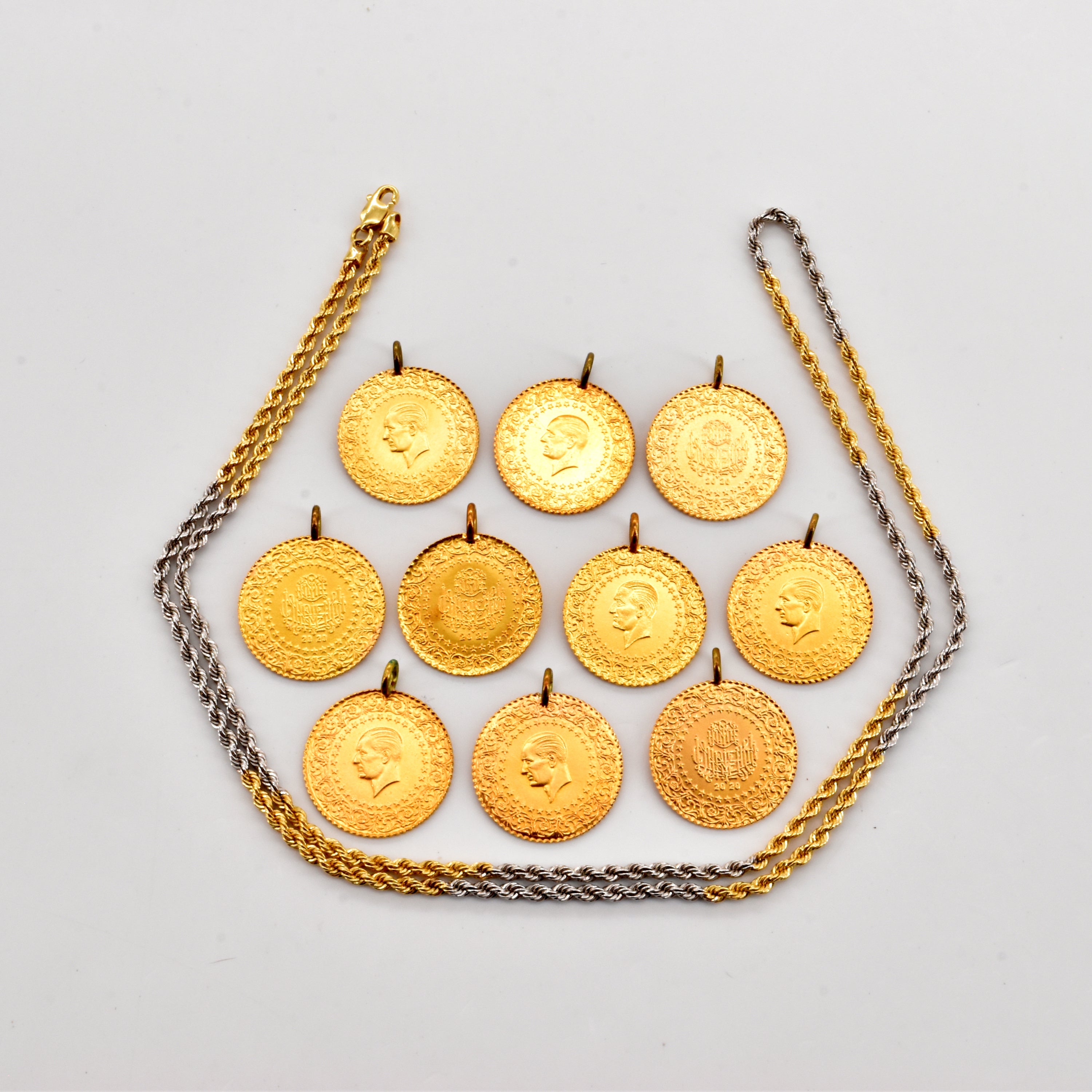 Halsketting en 10 hangers/muntstukken in 18 kt geel- en witgoud (delen in metaal) - 21.6 g bruto (50 cm)