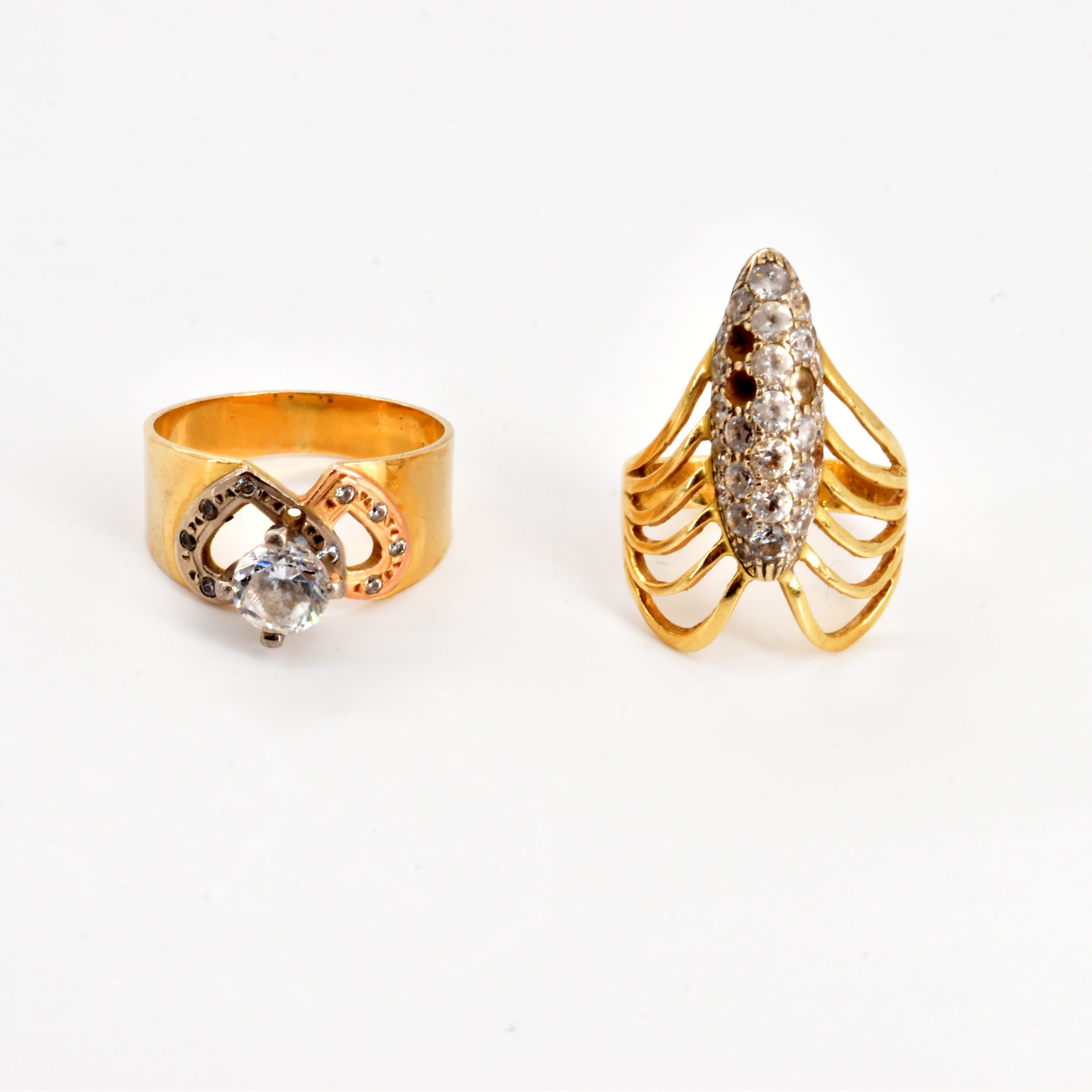 2 ringen in 18 kt geel- en witgoud (valse stenen, stenen ontbreken) - 13 g bruto (Maten: 49 & 56)