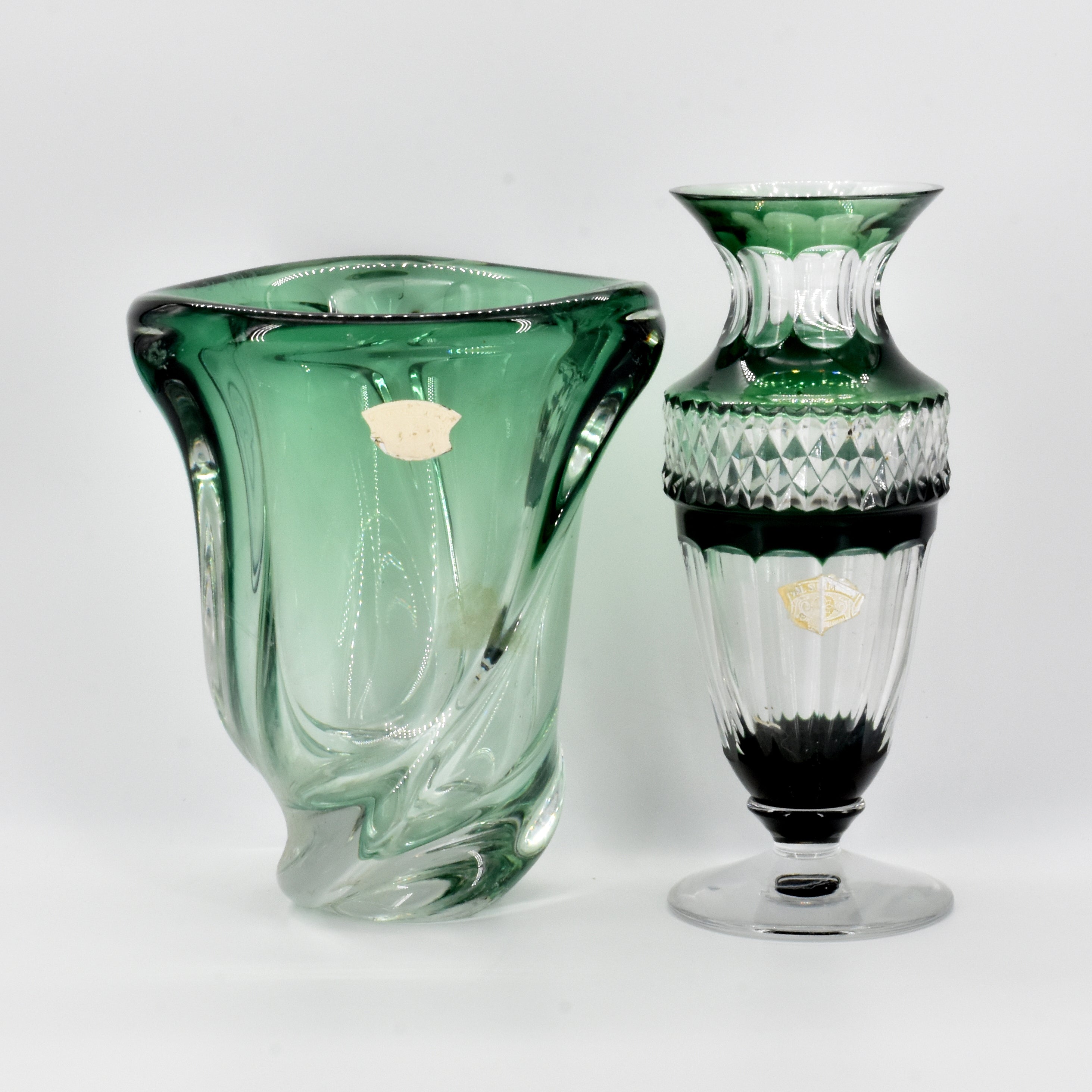 Lot bestaande uit: vaas in geslepen kleurloos kristal VAL SAINT-LAMBERT (H: 29 cm), fruitkom in kristal (gekrast) (Diam: 38 cm, H: 12 cm) en lamp in tweekleurig kristal VAL SAINT-LAMBERT (licht gekrast) (H: 32 cm)
