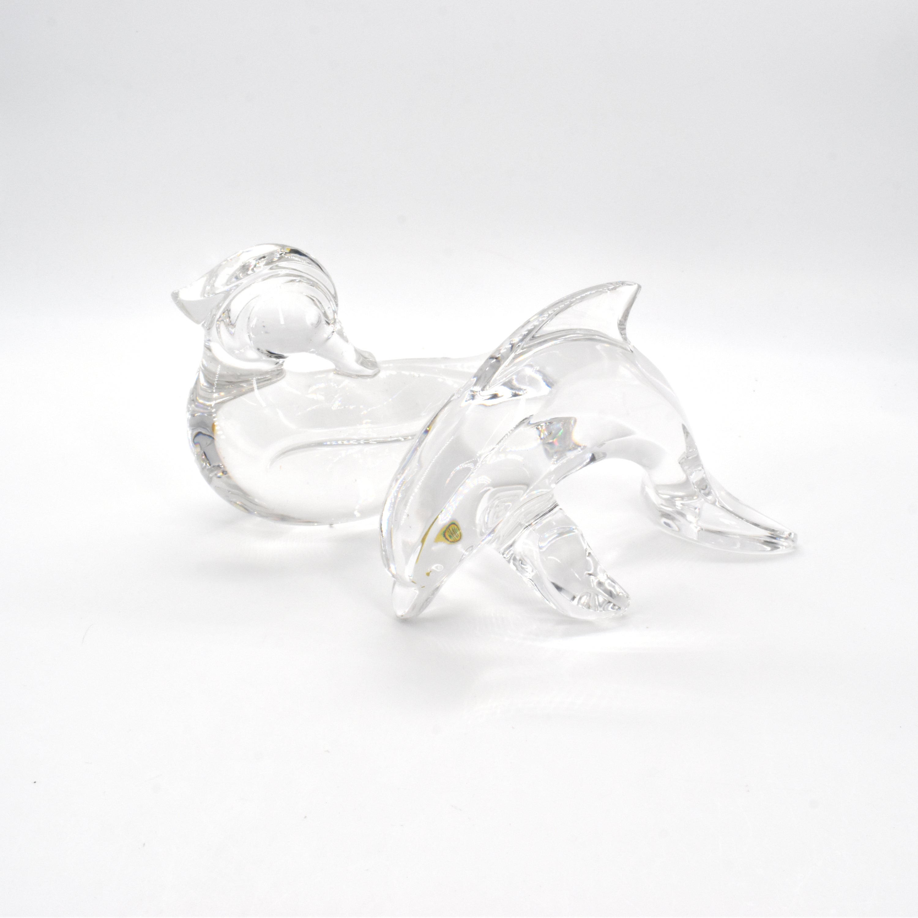 Een eend en een dolfijn in kristal, getekend VAL SAINT-LAMBERT (15 x 18 cm & 13 x 18 cm)