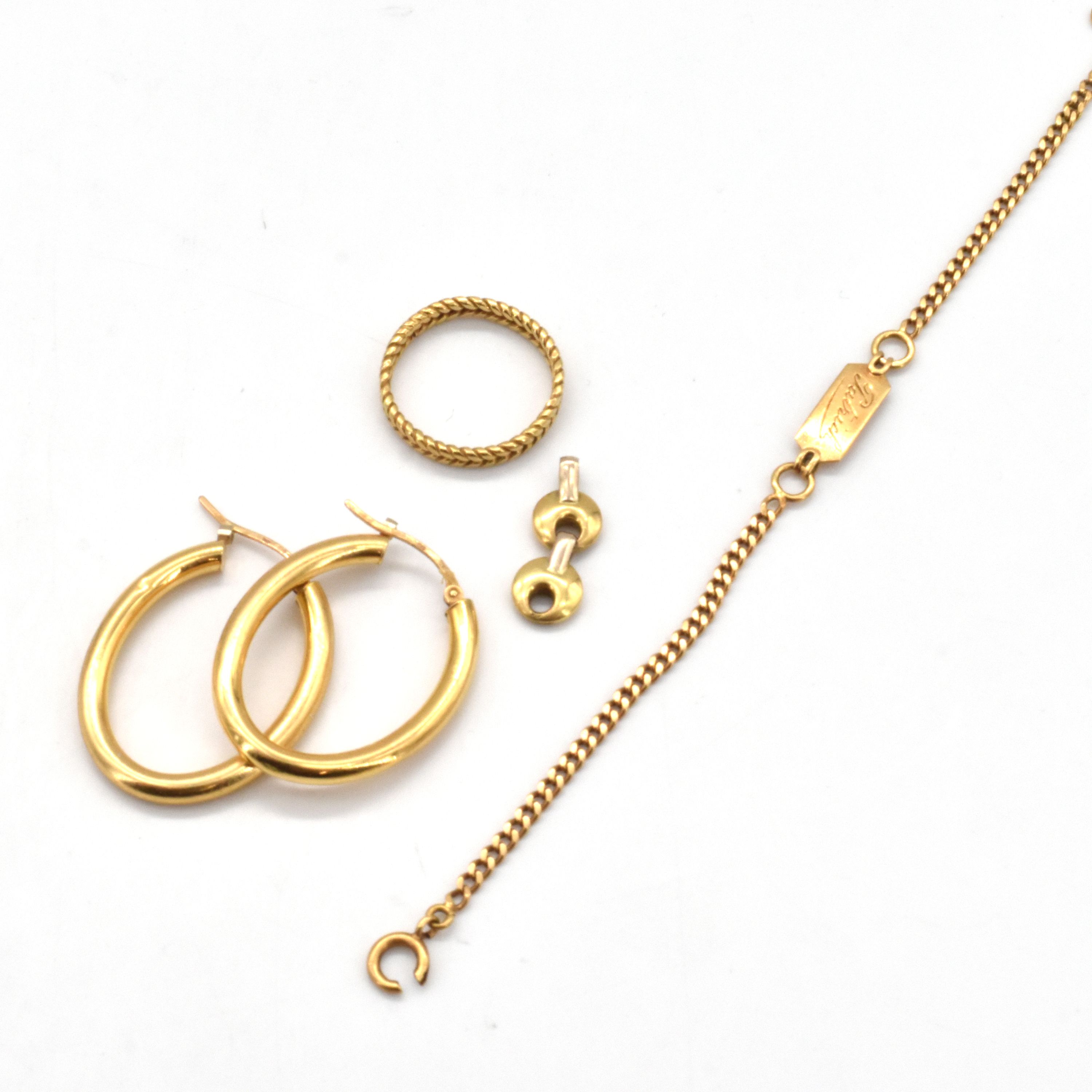 Ring, schakelarmband, 2 oorringen en stuk van ketting in 18 kt geel- en witgoud (gepersonaliseerd, sluiting gebroken, sluiting in pleetgoud, gedeukt) - 7.9 g (Maat: 50) (15 cm)