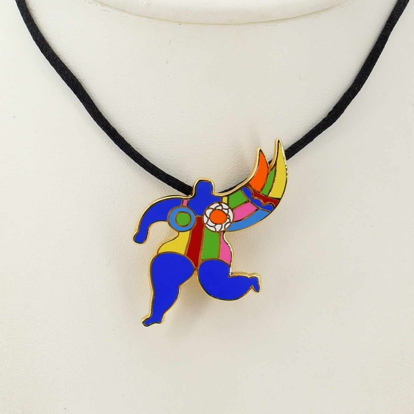 Halsketting-borstspeld in koord met sluiting en geëmailleerde hanger in pleetgoud NIKI DE SAINT-PHALLE: Nana + koker (28cm)