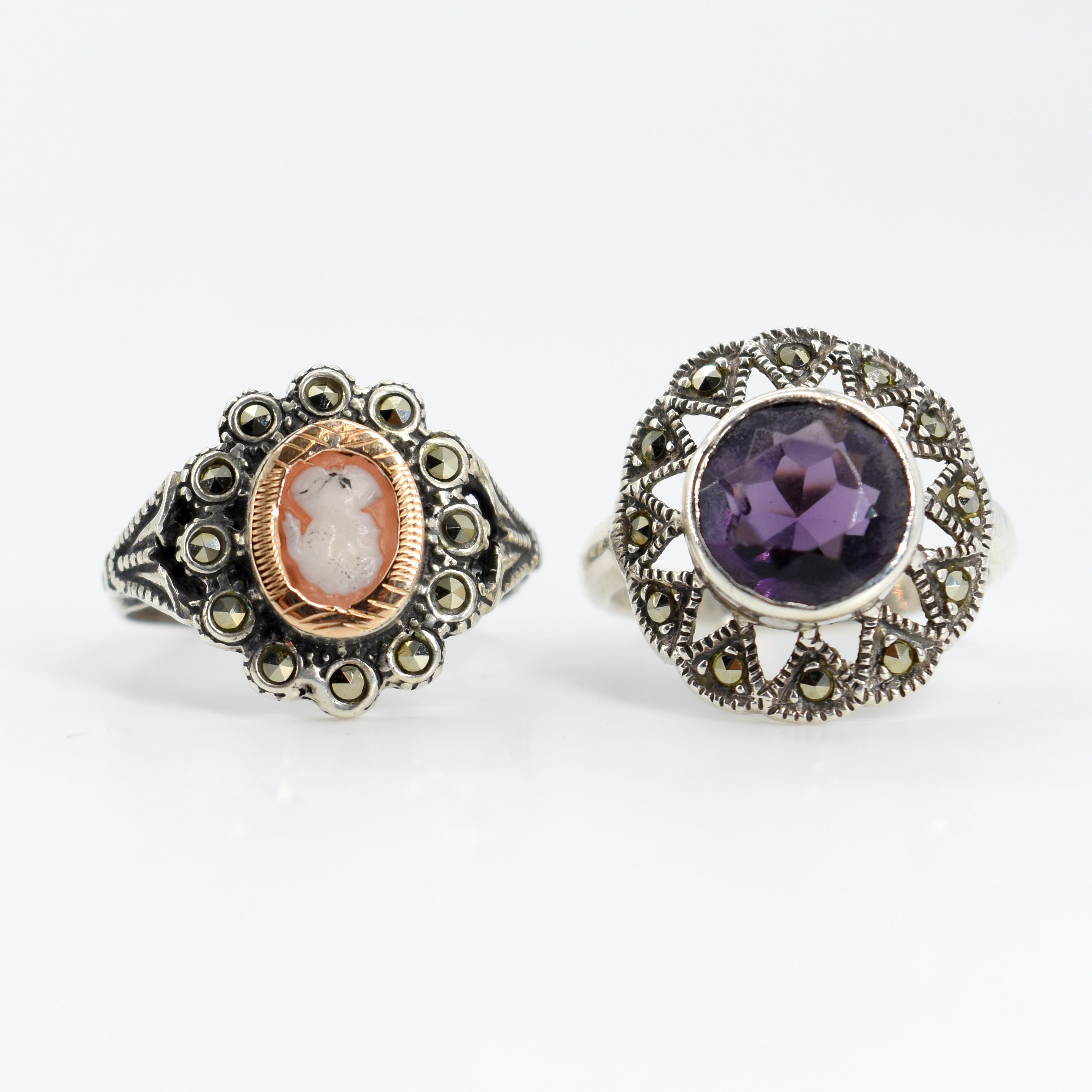 2 ringen in zilver 800/1000 en 925/1000 met gedeelte in 14 kt geelgoud bezet met 1 camée (kleursteen) - 7.5 g bruto + koker (Maten: 54 & 51)