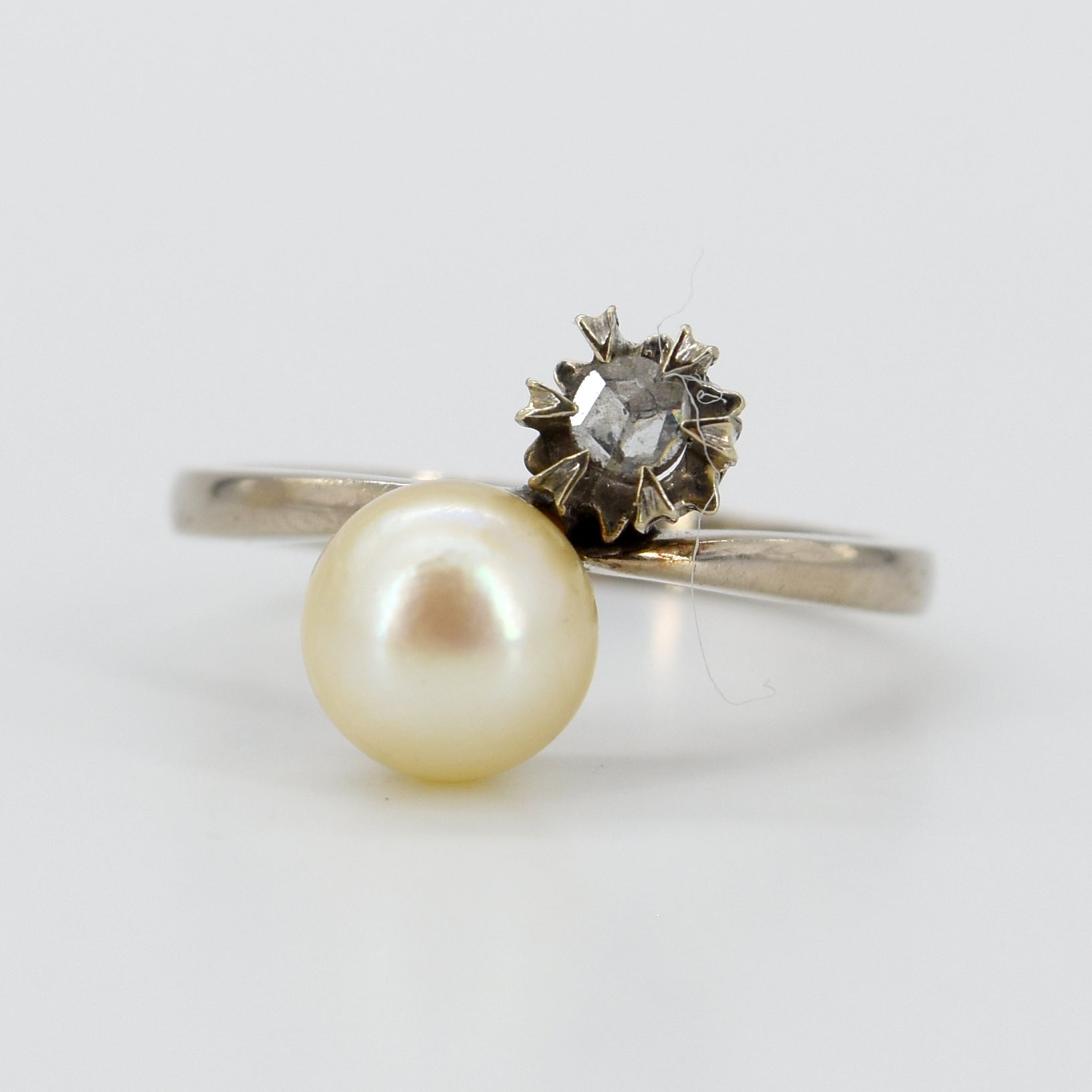 Ring in 18 kt witgoud bezet met 1 diamantroosje en 1 parel (beschadigd, gedeukt) - 3.1 g bruto (Maat: 54)