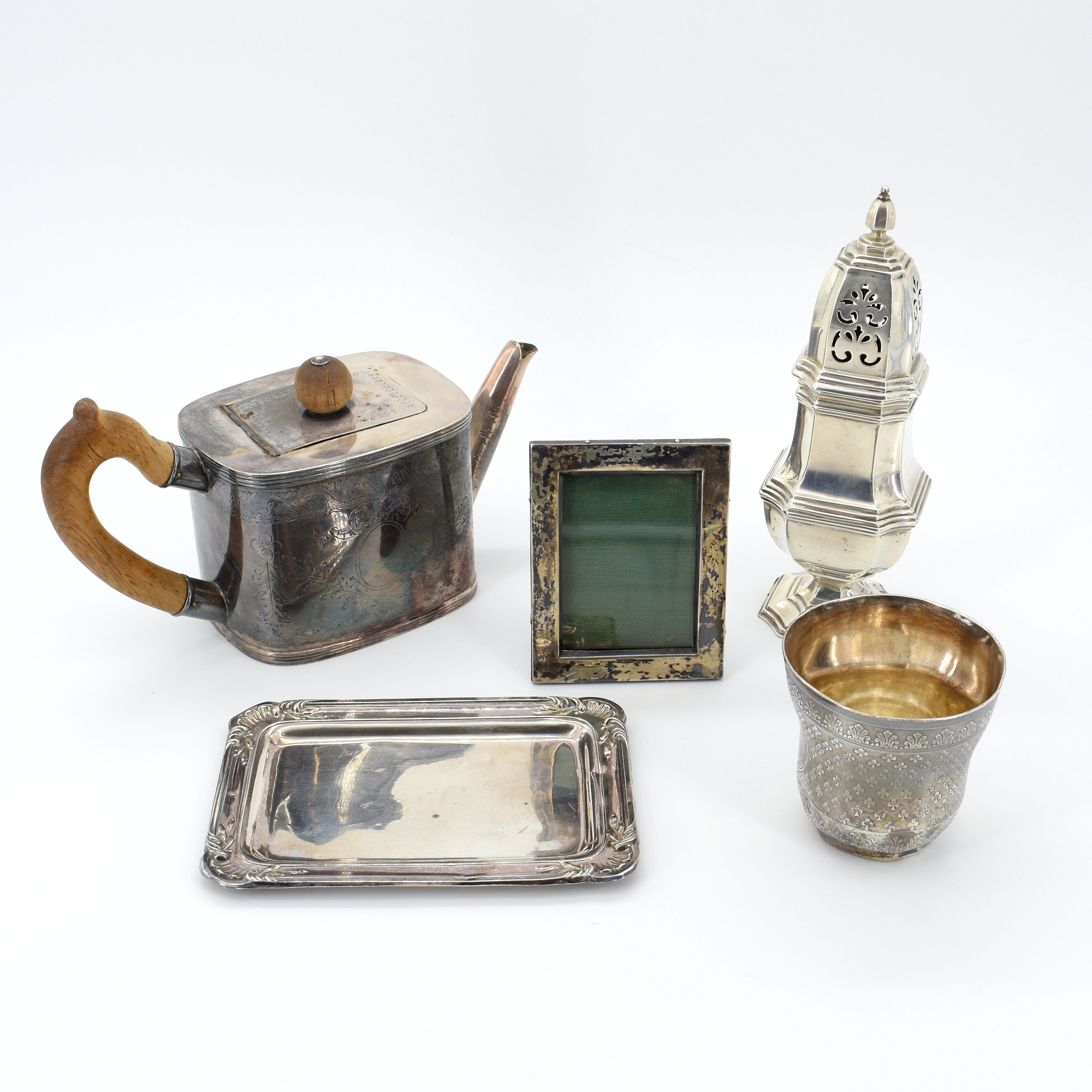 Klein dienblad, beker, poedersuikerpot, theepot en fotolijst in zilver (delen in hout, glas, geoxideerd, gepersonaliseerd, gedeukt) - 732.4 g bruto