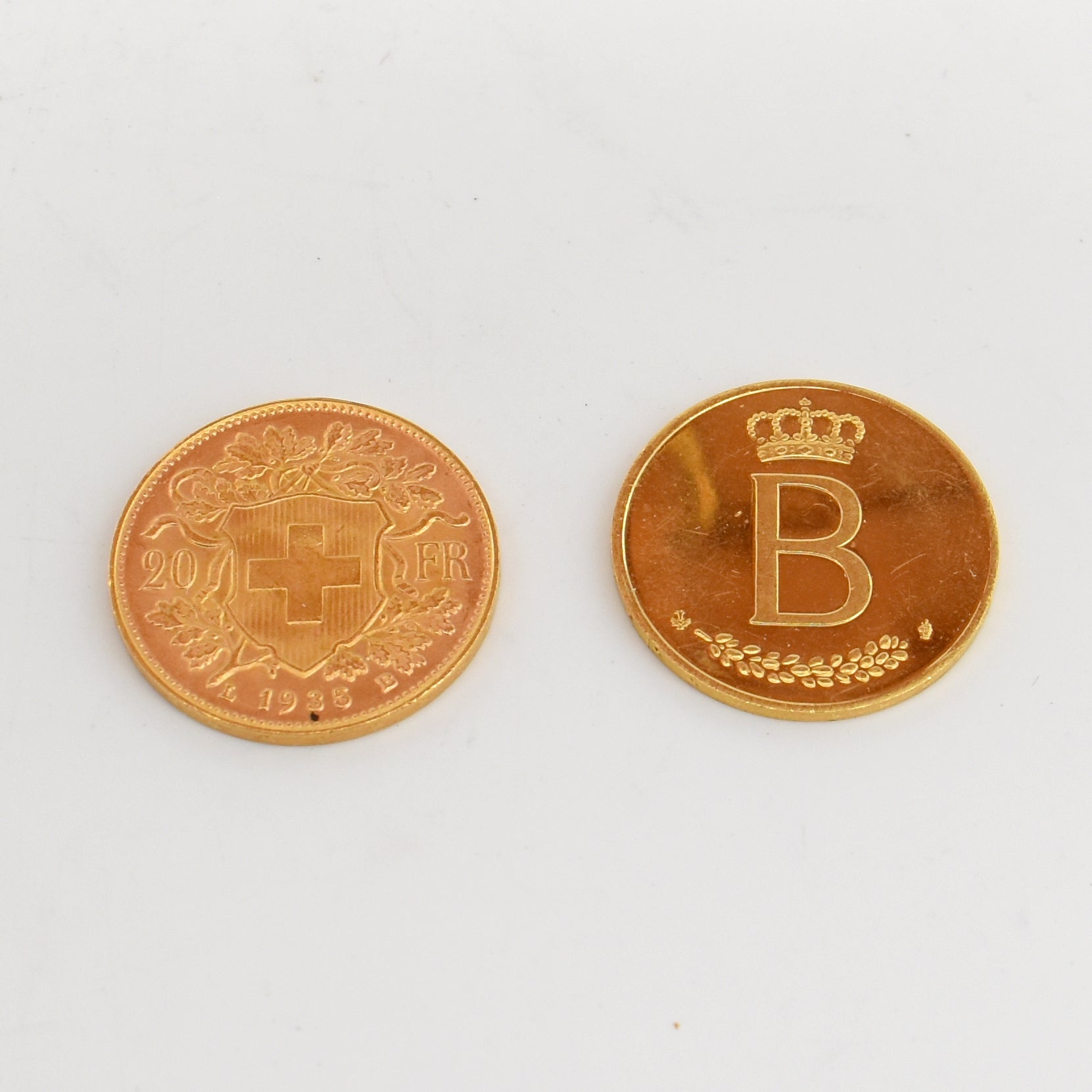 Medaille 25ste verjaardag van Koning Boudewijn 1ste in geelgoud 900/1000 - 6.4 g Muntstuk in geelgoud 900/1000 (zwitsers-20 CHF-1935) - 6.4 g