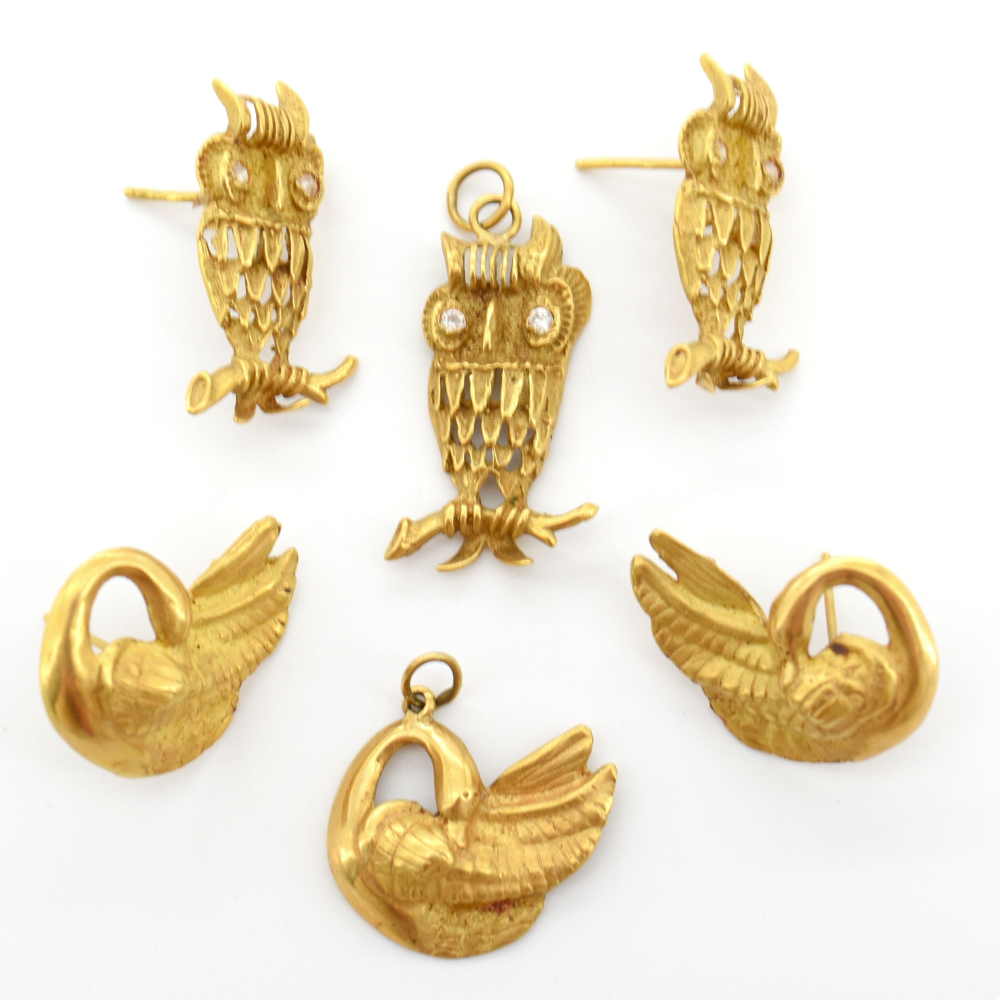2 hangers en 4 oorringen in 18 kt geelgoud (valse stenen, drukknoop in plastiek, 3 drukknopen ontbreken, gedeukt) - 27.4 g