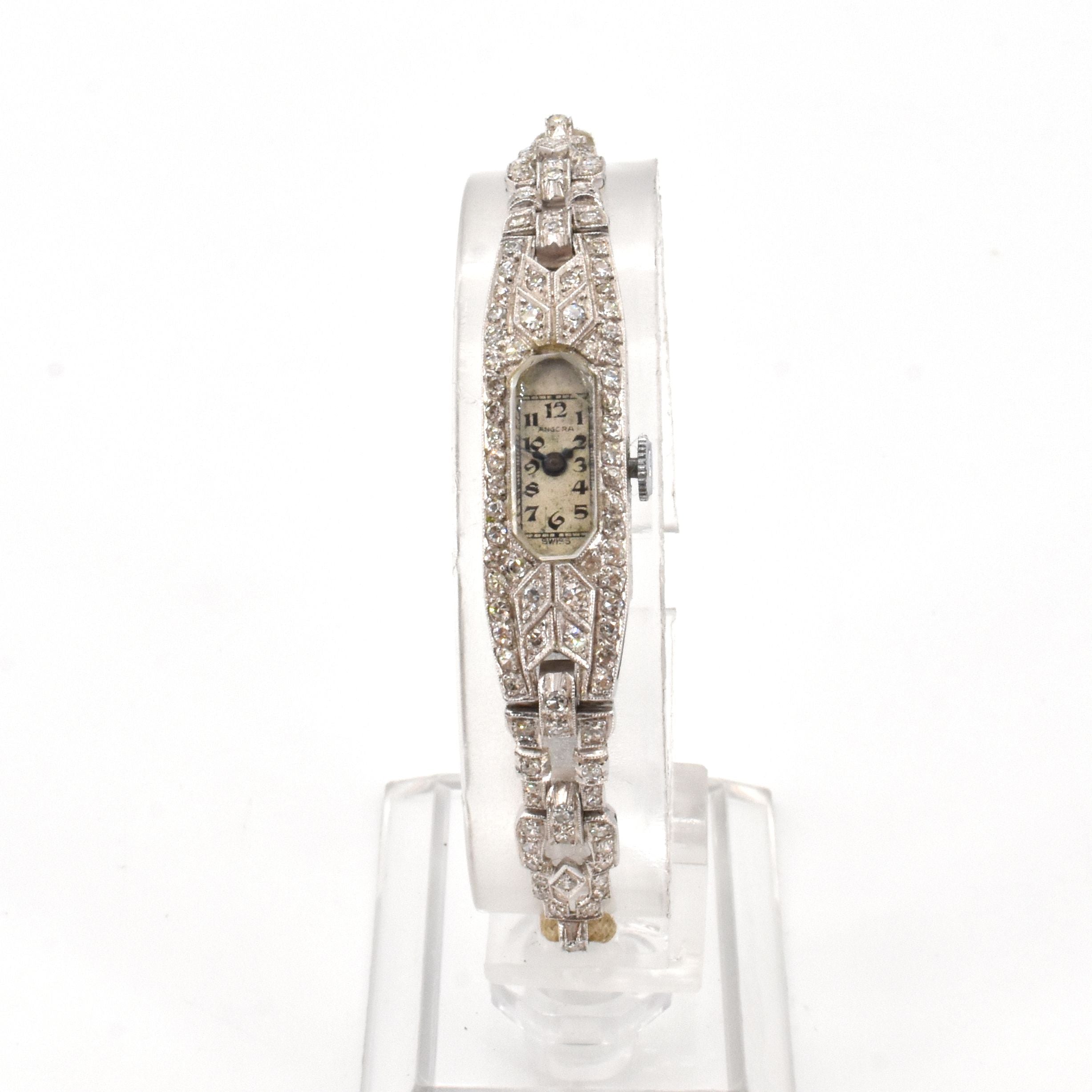 Damespolshorloge in platina ANGORA mechanisch bezet met 103 diamanten 8/8 slijpsel +/- 1 kt (armband in koord met sluiting in metaal, ontregeld) - 15.6 g bruto (16.5 cm)