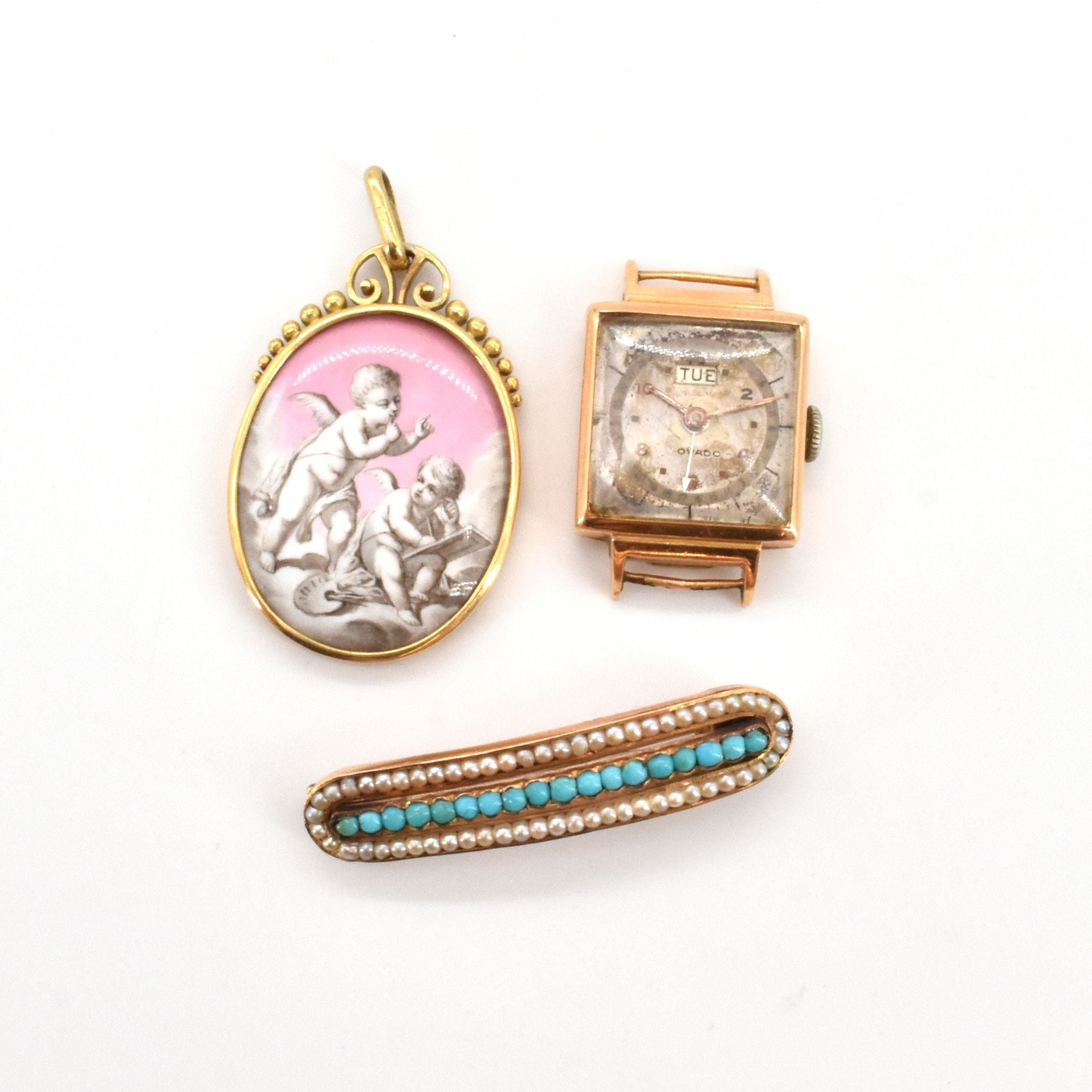 Hanger en borstspeld in 18 kt geelgoud (kleurstenen, parels, porselein, tin) - 8.3 g bruto Uurwerk in 18 kt geelgoud MOVADO mechanisch (armband ontbreekt, beschadigd) - 11.5 g bruto