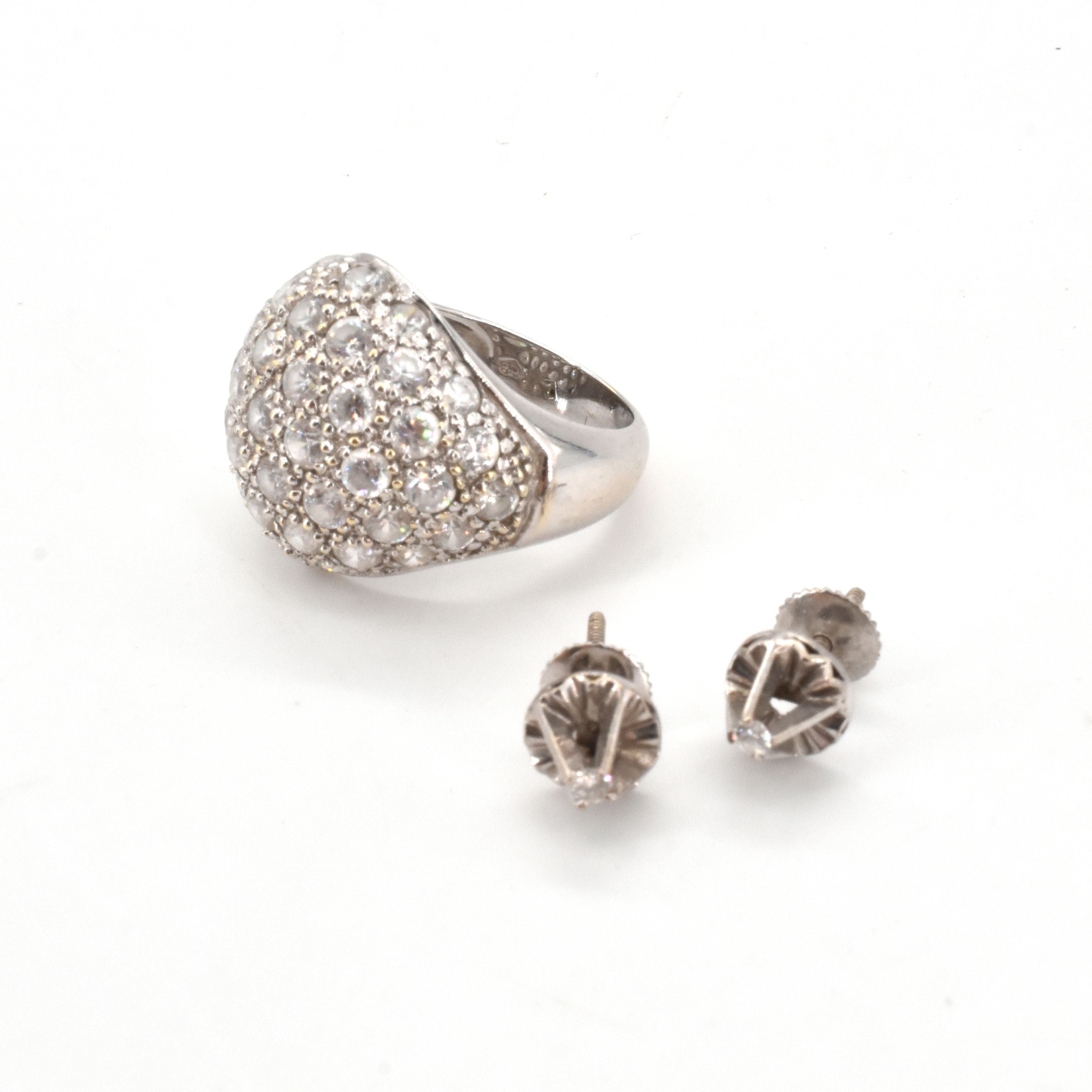 Ring in 18 kt witgoud (valse stenen, steen ontbeekt) - 8.1 g bruto (Maat: 52) 2 oorringen in zilver bezet met 2 briljanten +/- 0.10 kt - 1.4 g