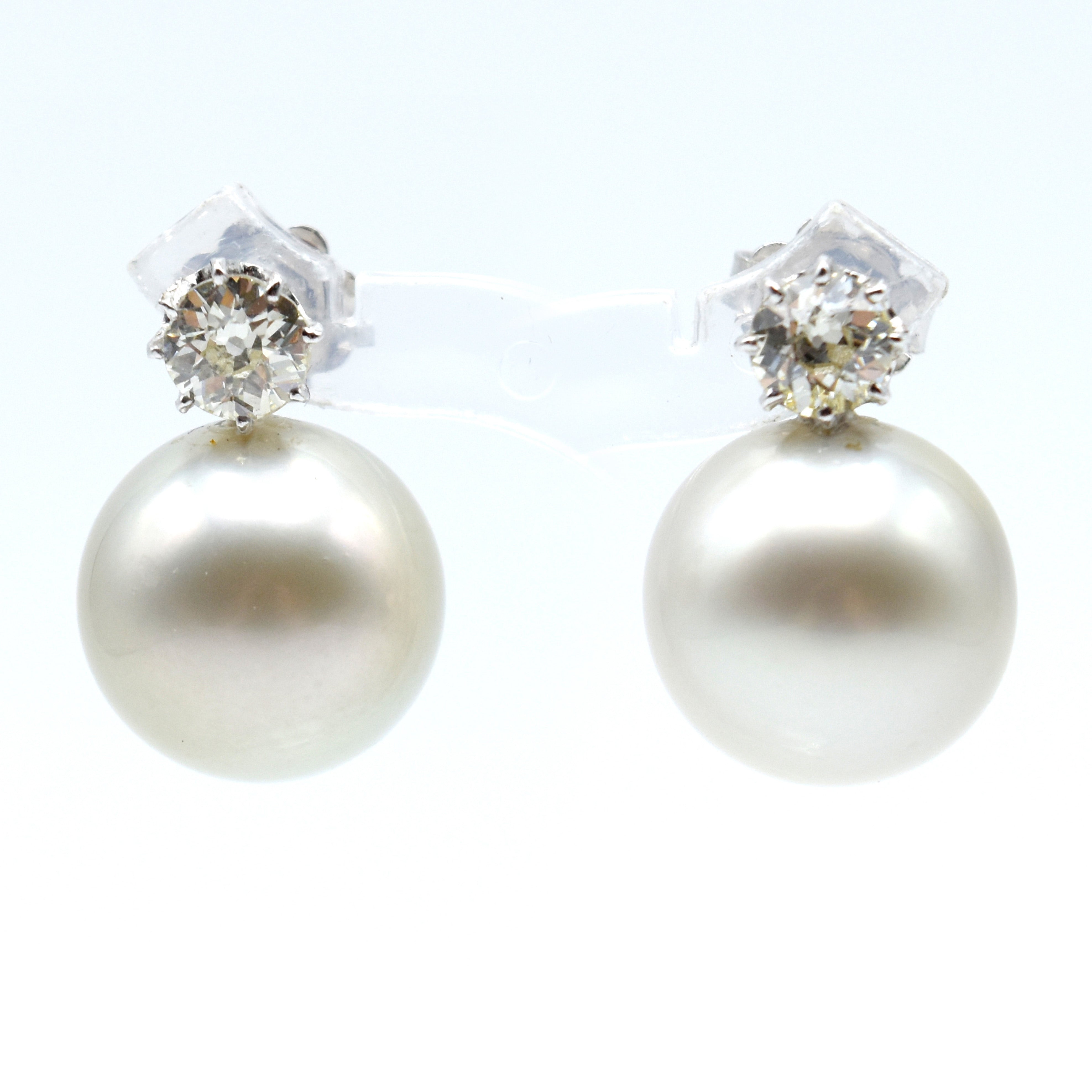 2 oorringen in 18 kt witgoud bezet met 2 diamanten oud slijpsel +/- 0.80 kt en 2 Zuidzeeparels - 8.7 g bruto