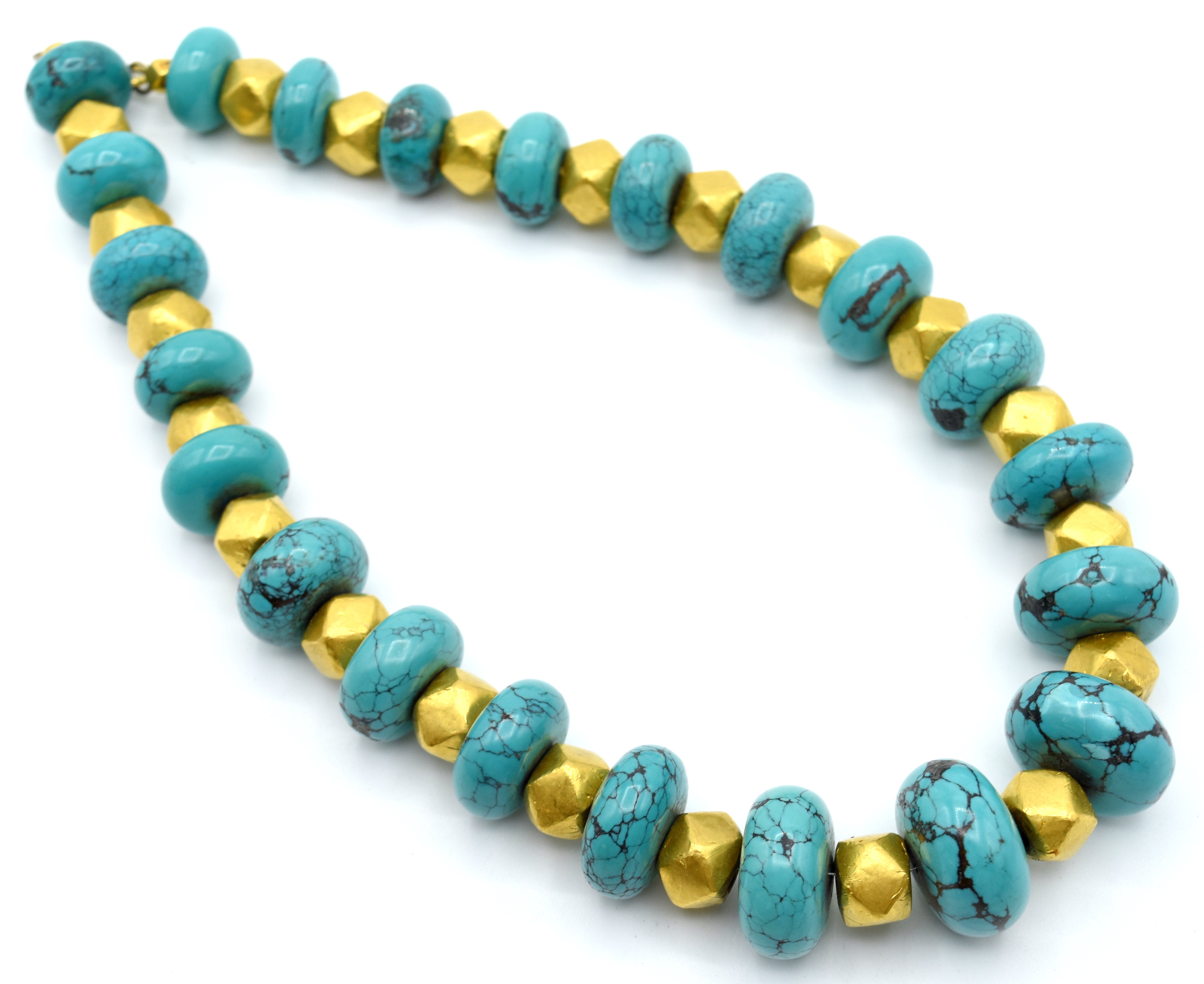Halsketting van turkooise kralen met sluiting en gedeelten in 18 kt geelgoud (gedeukte metalen onderdelen, met was versterkte onderdelen) - 182.6 g bruto (49 cm)